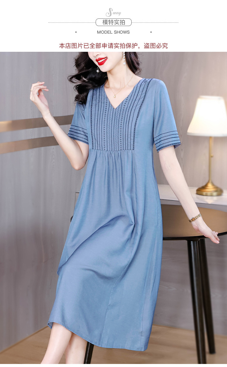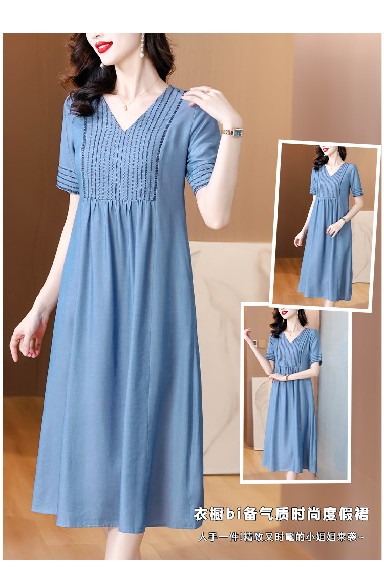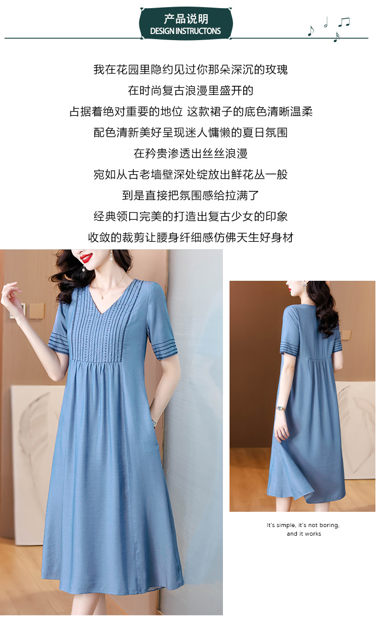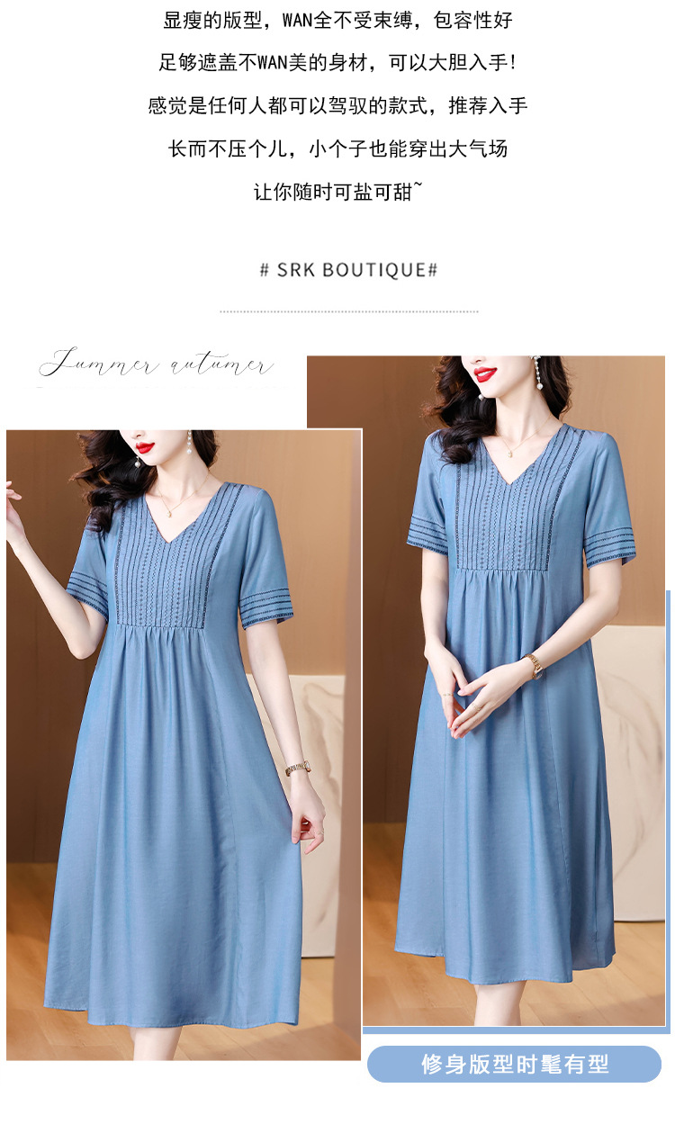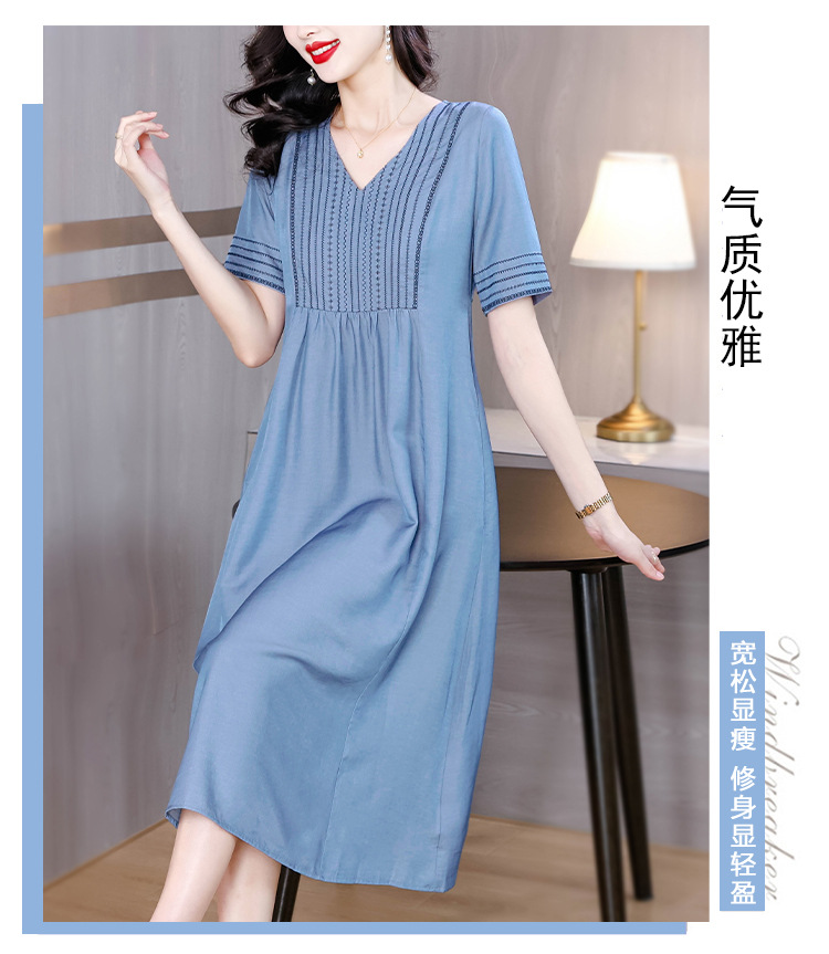 Yjr9520春夏vネック半袖ワンピース女性がゆったりとお腹を隠しています。