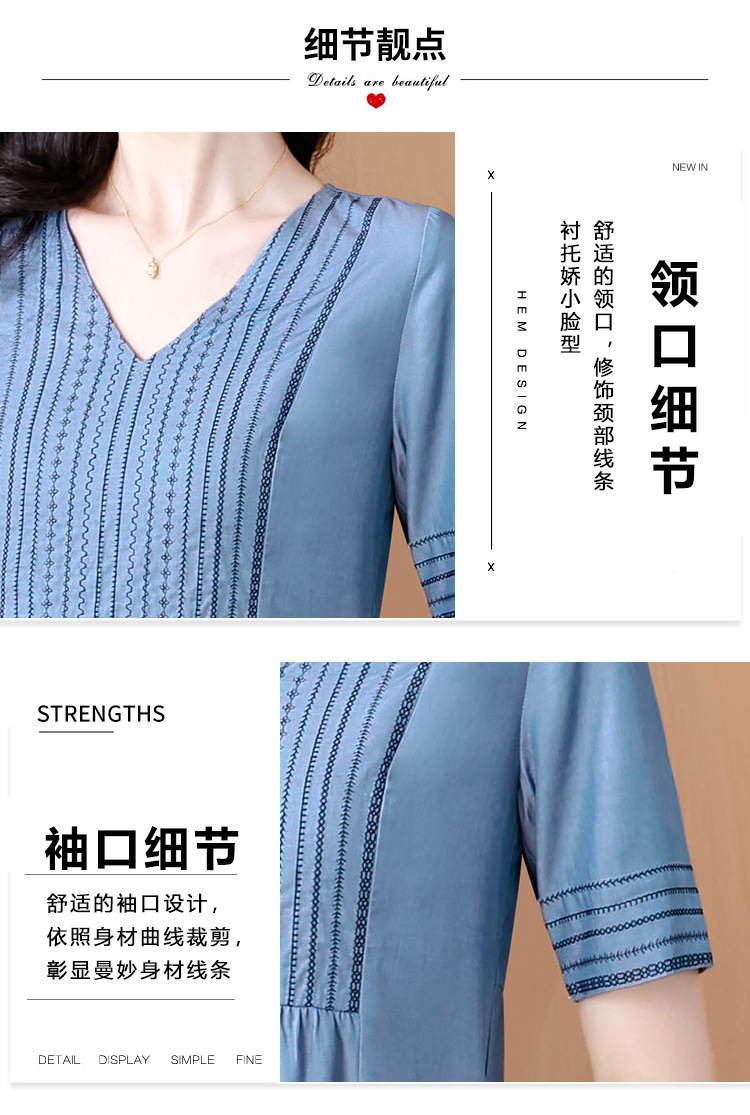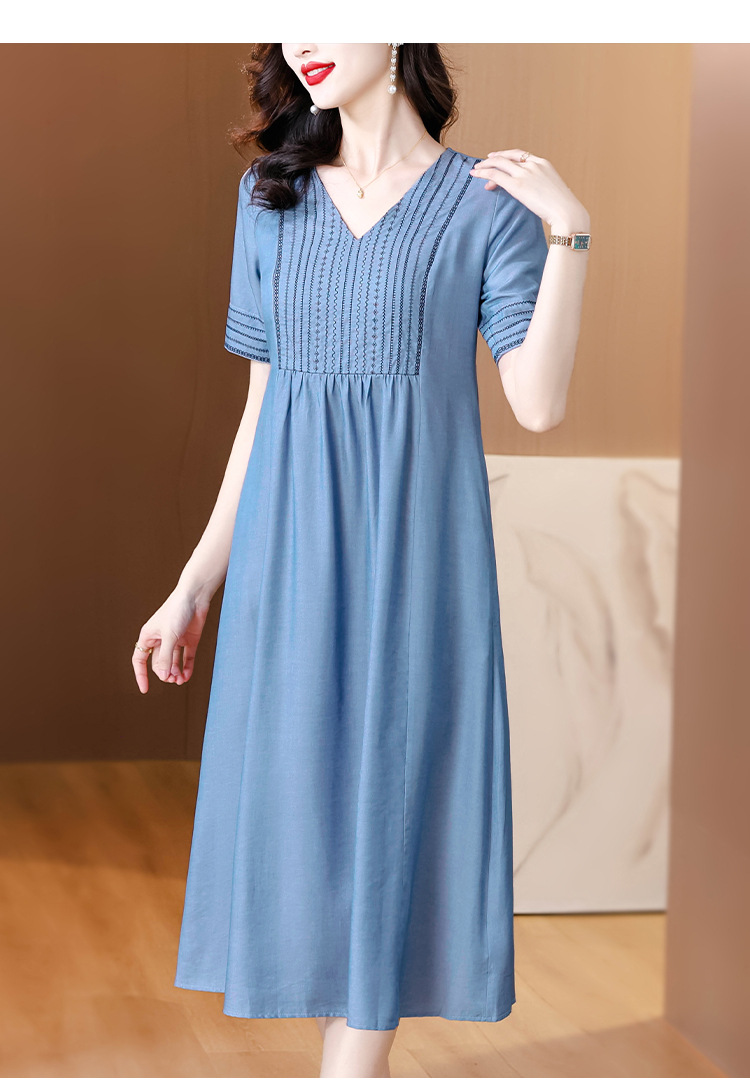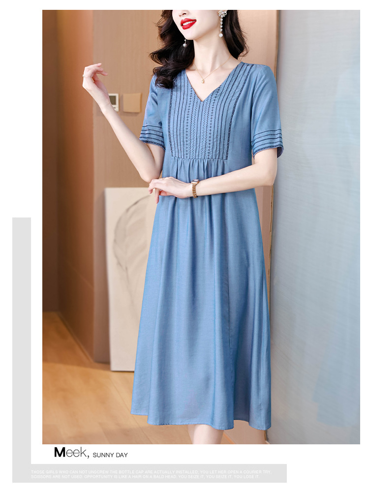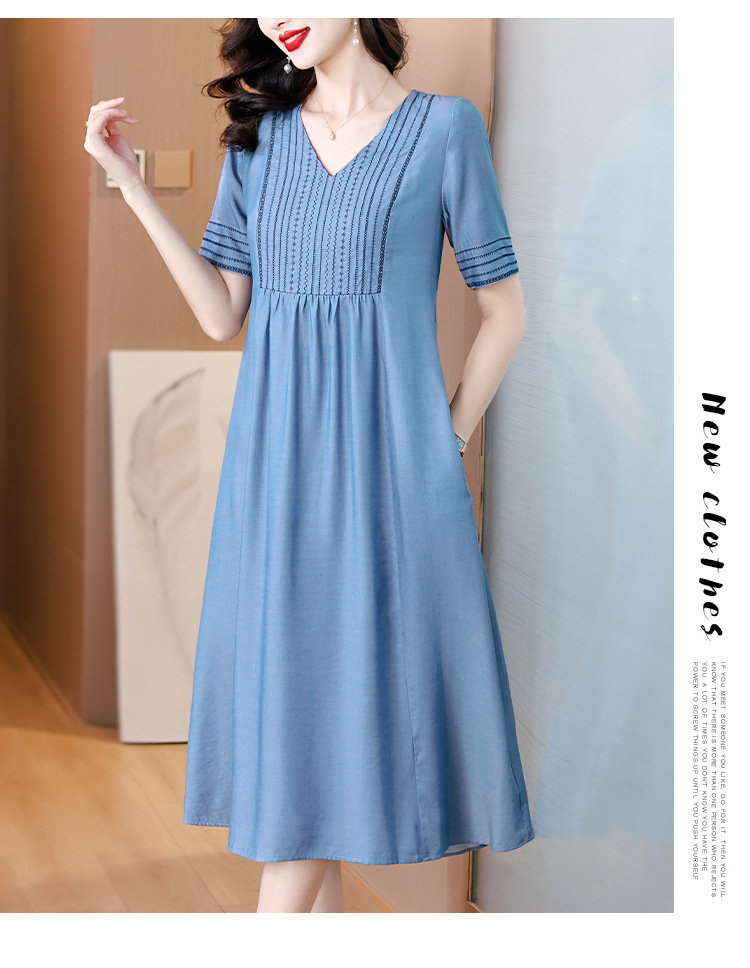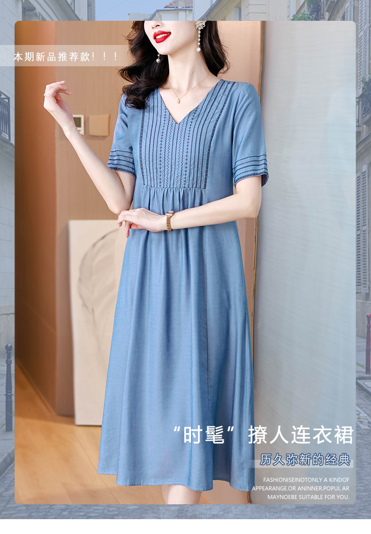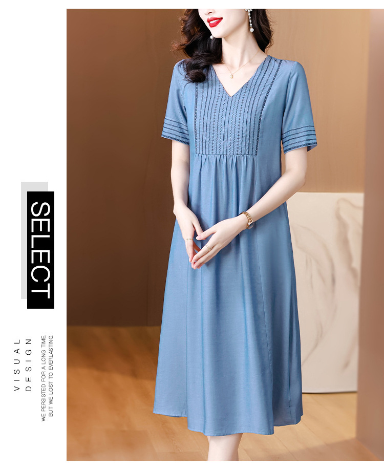 Yjr9520春夏vネック半袖ワンピース女性がゆったりとお腹を隠しています。