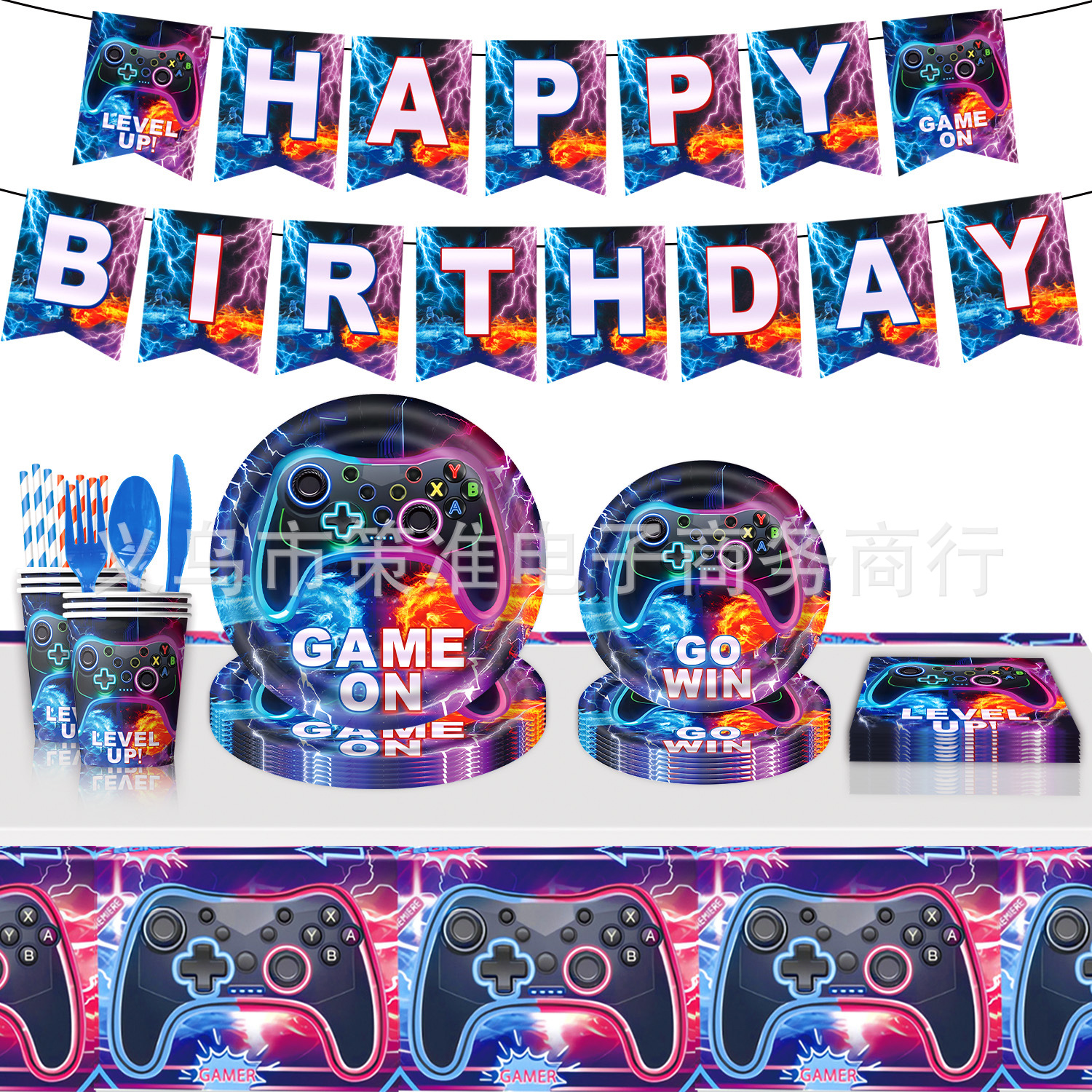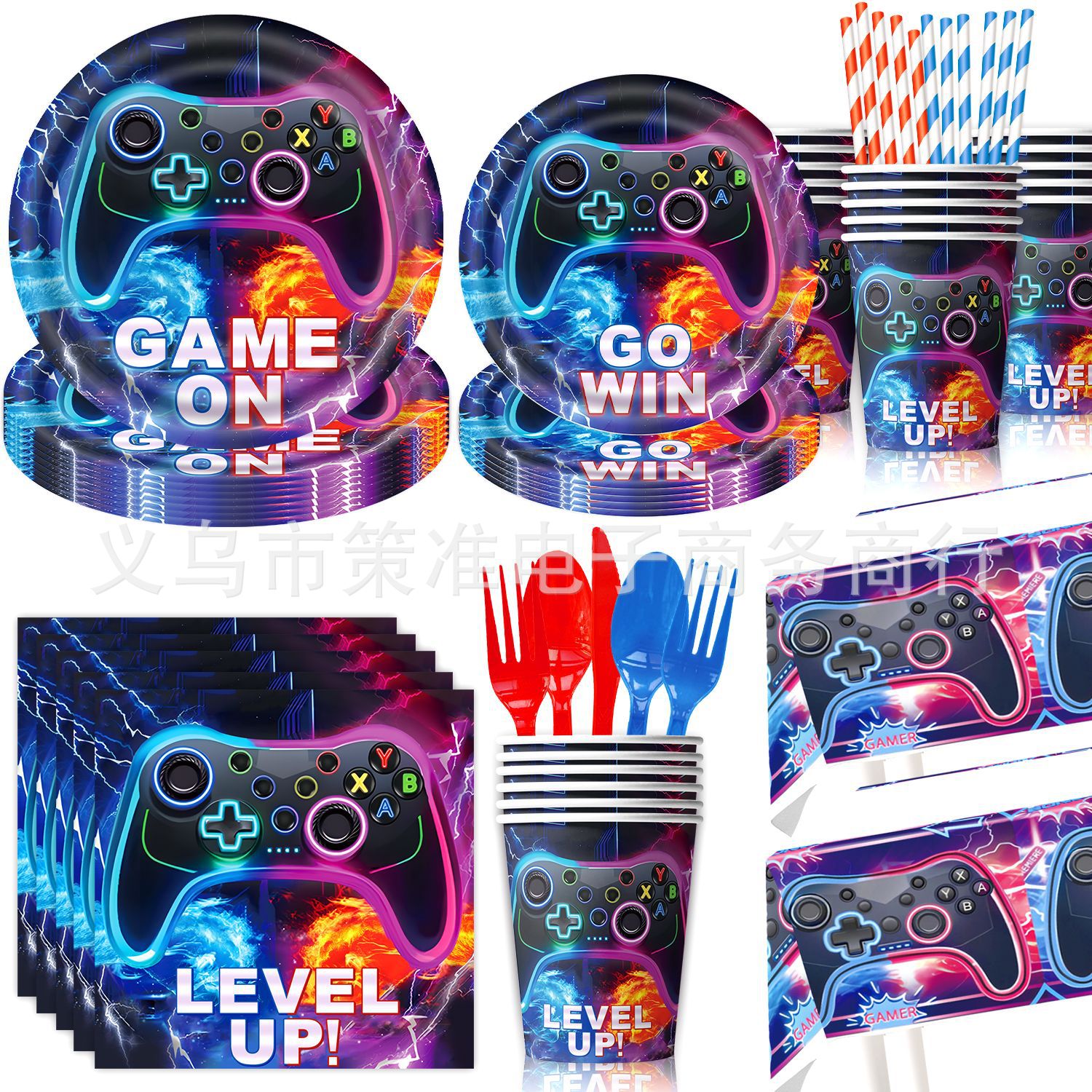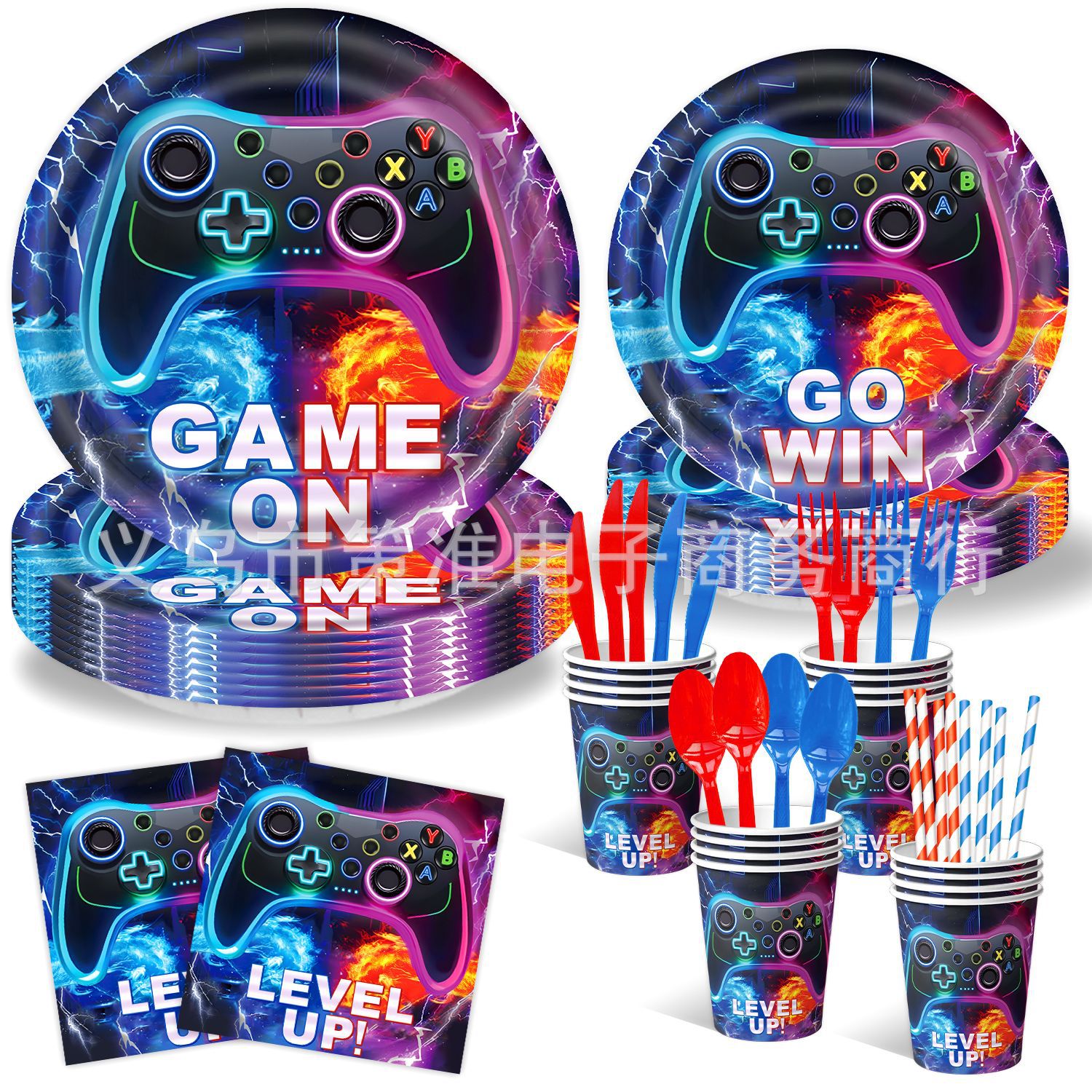 アマゾンの新しいハンドルのゲームのテーマの男の子の誕生日のパーティーの食器の使い捨てのテーブルクロスのティッシュの紙の皿の装飾