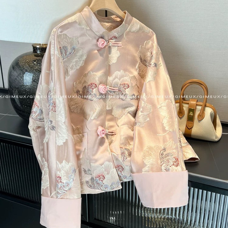 新中国風ジャカードサテンコート女性春の高級レトロ改良唐装対襟盤ボタン小衆上着