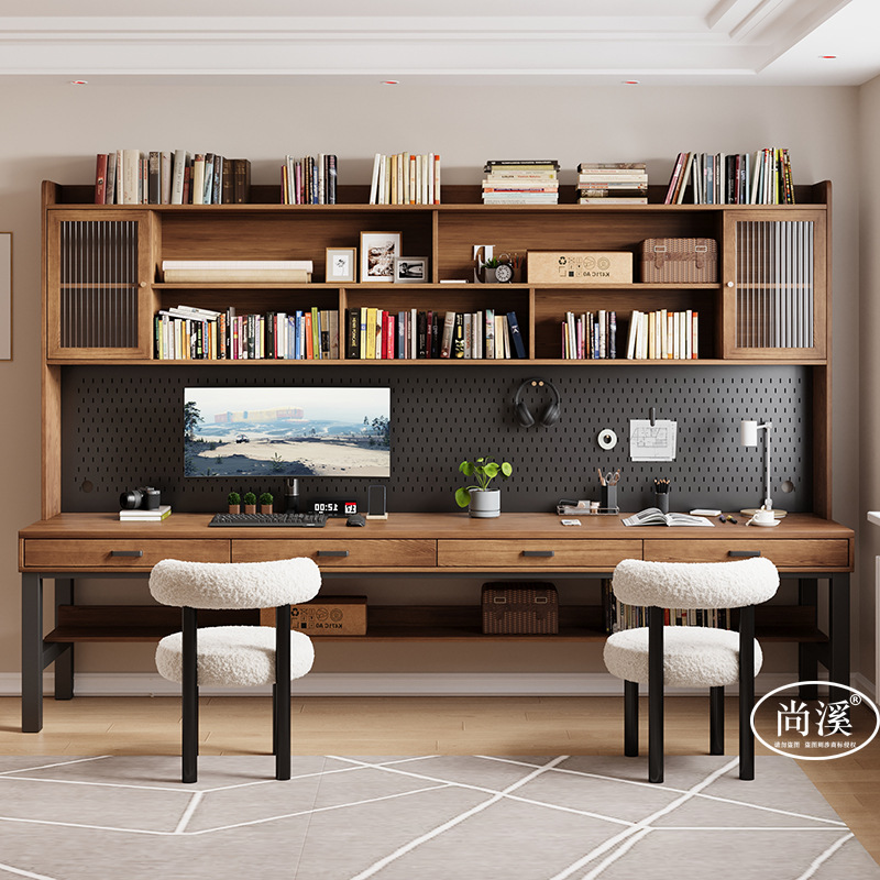 实木书桌书柜洞洞板一体靠墙电脑桌双人学习桌带抽屉成人书房长桌