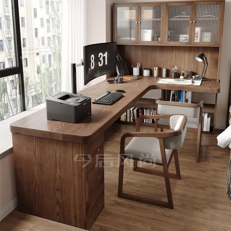 实木长桌书桌书柜书架组合转角式电脑桌书房卧室学习桌拐角写字桌