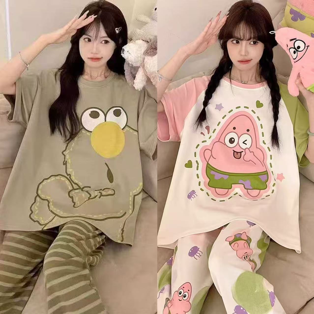 纯棉睡衣女款短袖长裤套装卡通薄款初中学生大码夏天可外穿家居服