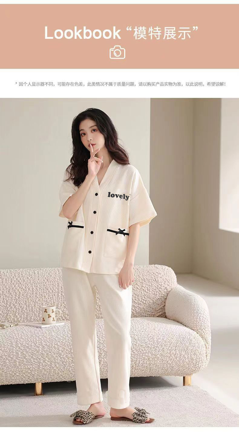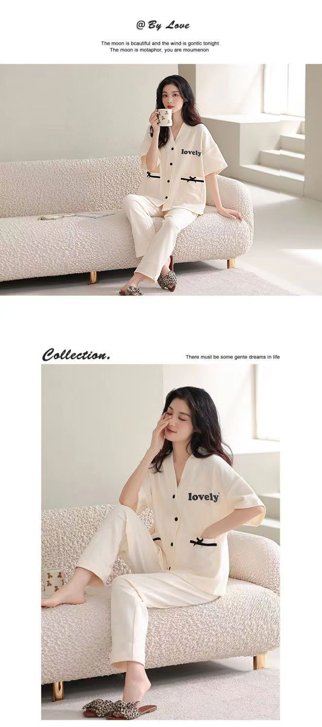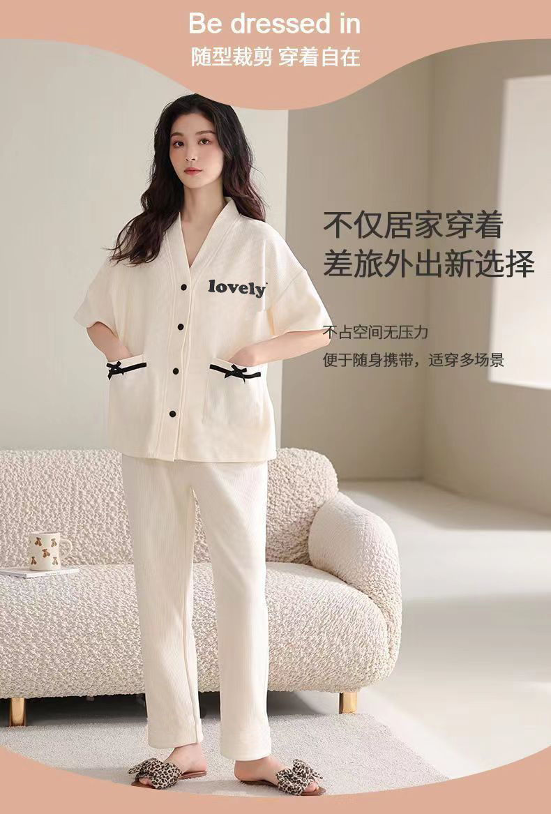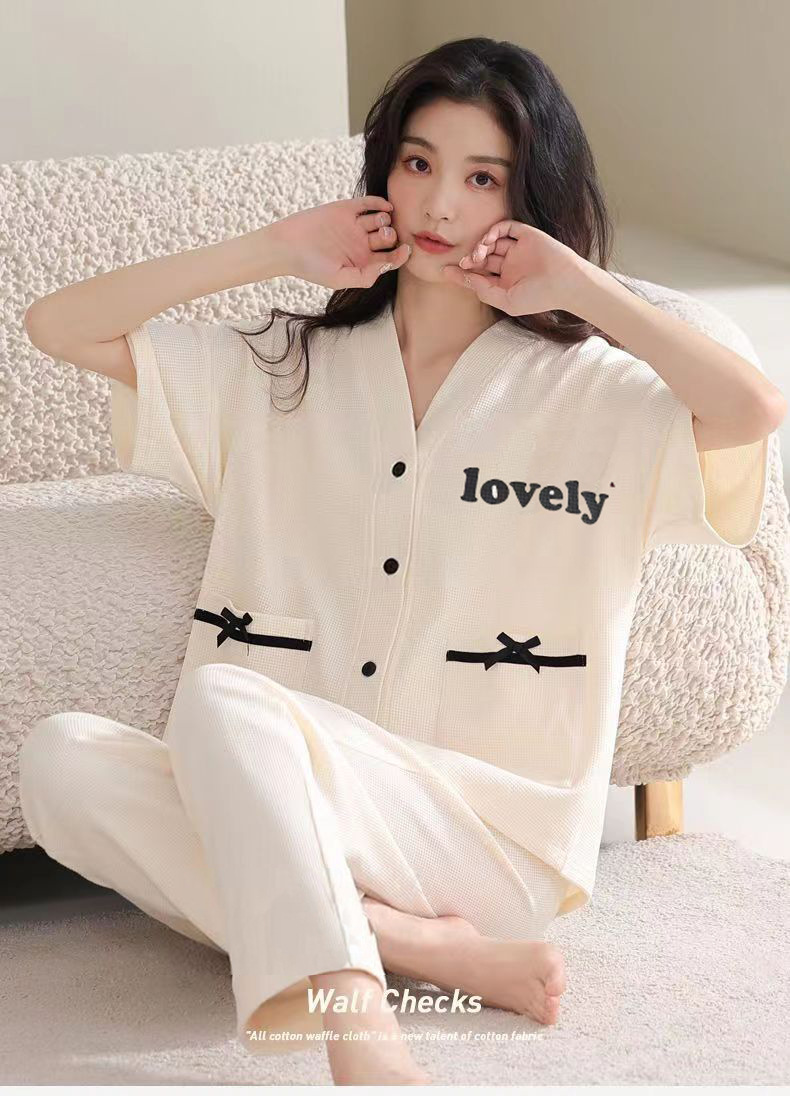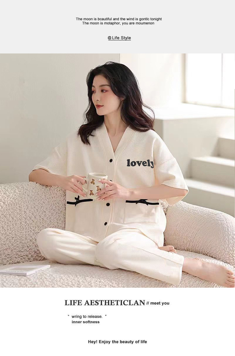 胸パッド付きパジャマ女性夏純綿カーディガン半袖七分ズボン甘美薄手カジュアル大サイズホームウェアセット