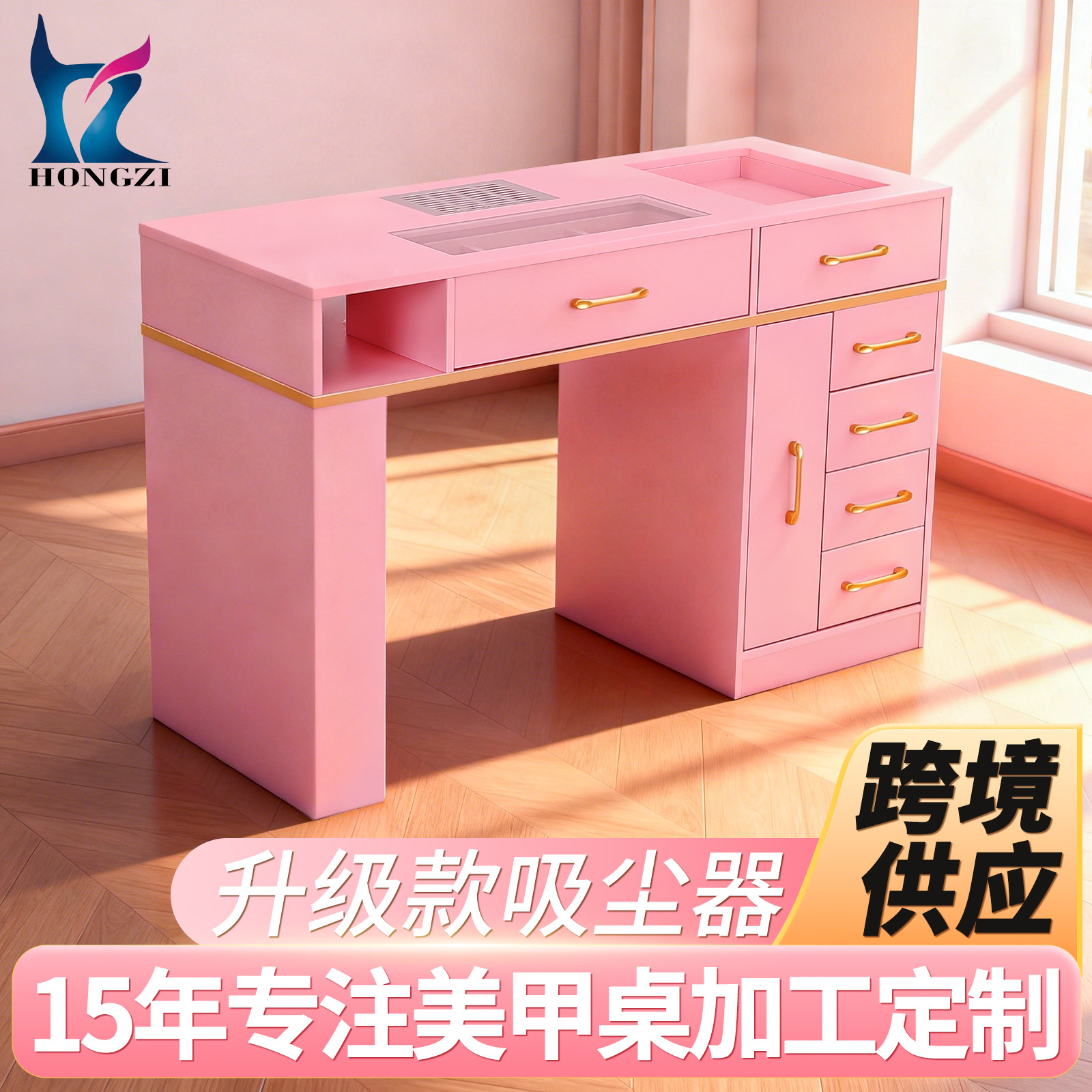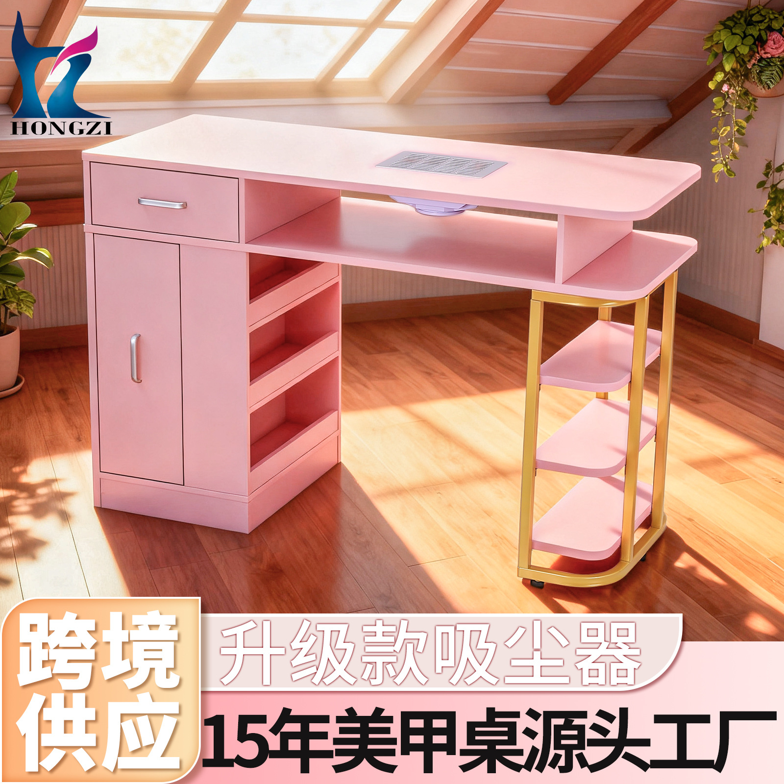 宏子源工場卸売 ピンクネイルテーブル 内蔵ネイルダストコレクター 収納区分付きネイルテーブル