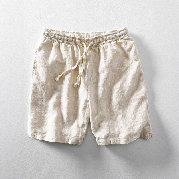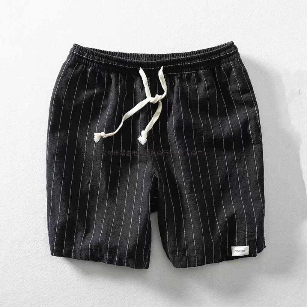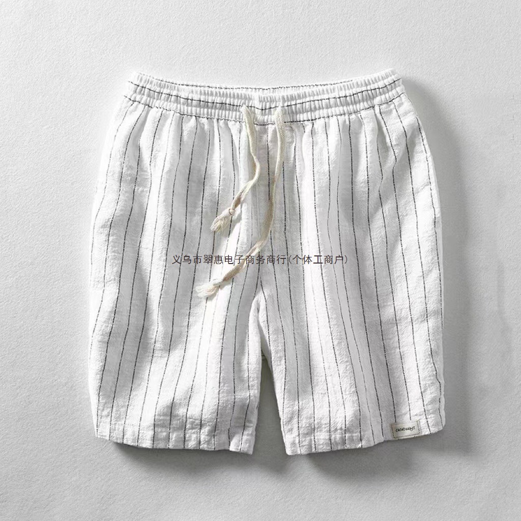 リネンショートパンツ男性夏ストライプスポーツパンツ綿麻布排汗ワイドストレッチ帯五分ビーチパンツ中ズボン潮