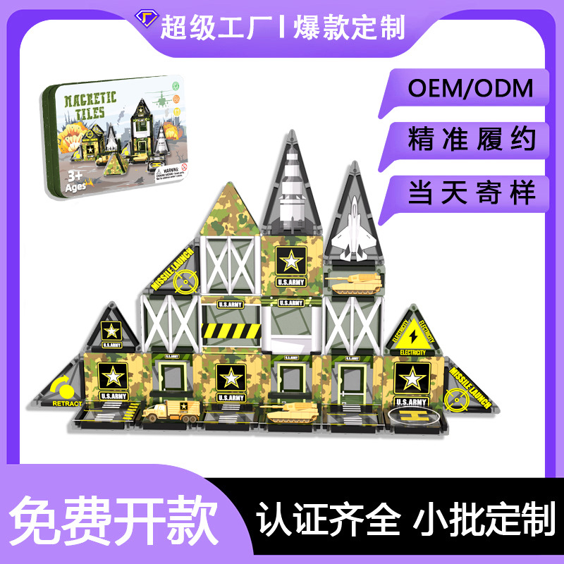 跨境迷你旅行幼儿套装军事主题磁力片印刷Magnetic Tiles磁性积木