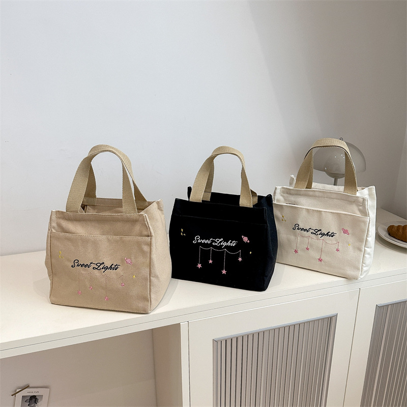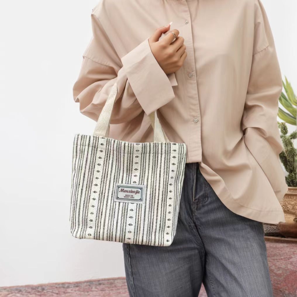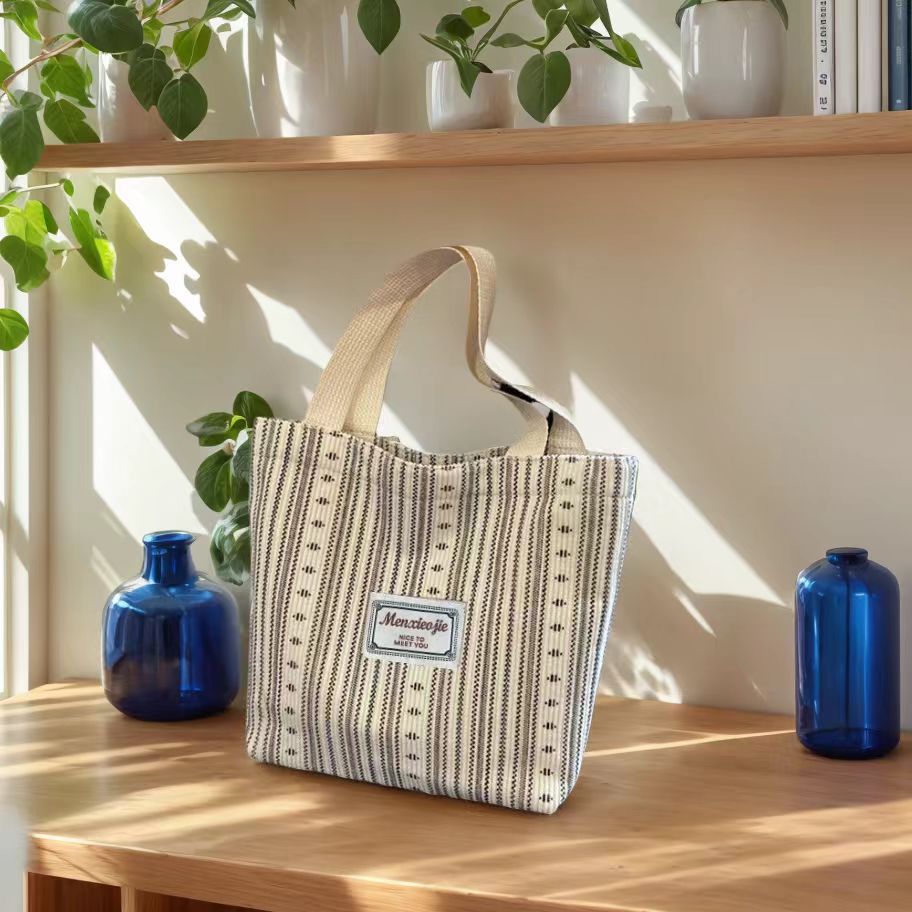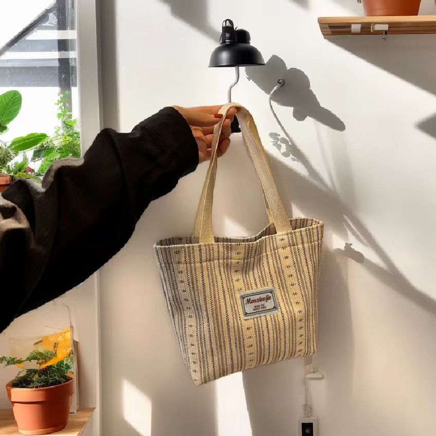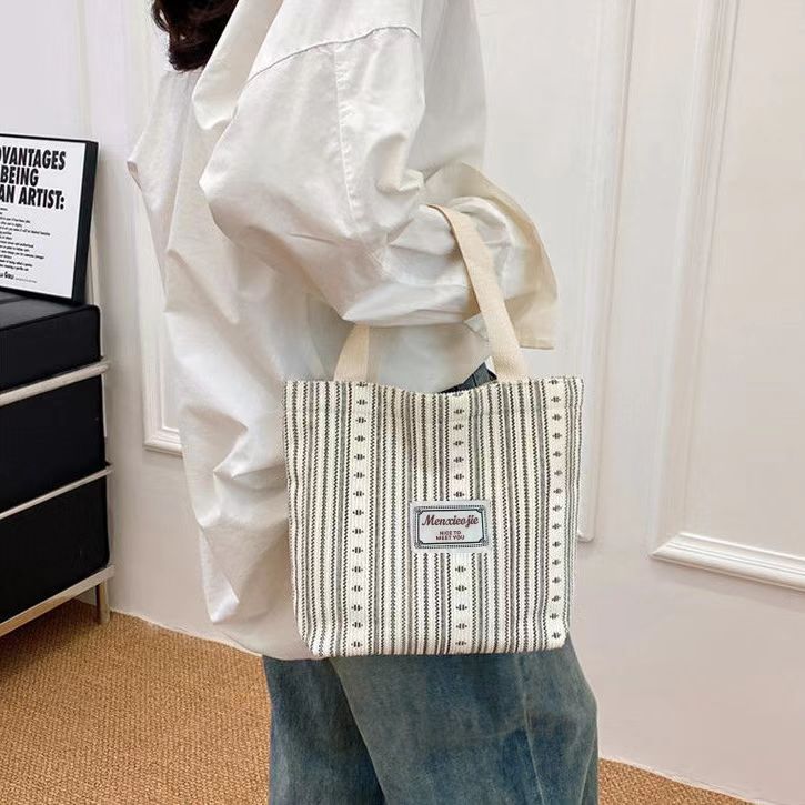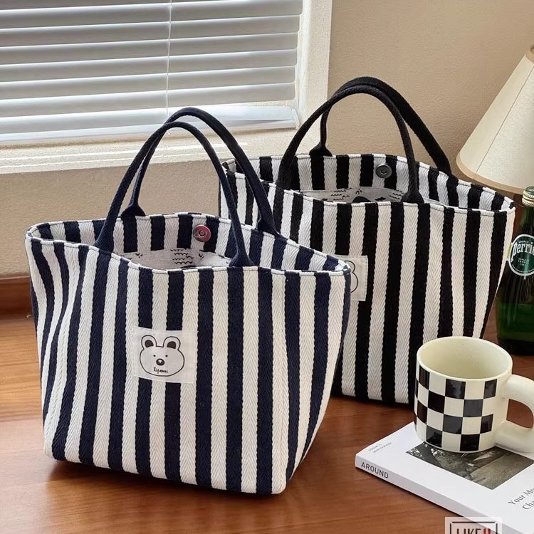 原创设计日系条纹小熊文艺帆布手提托特包百搭休闲学生通勤餐盒包