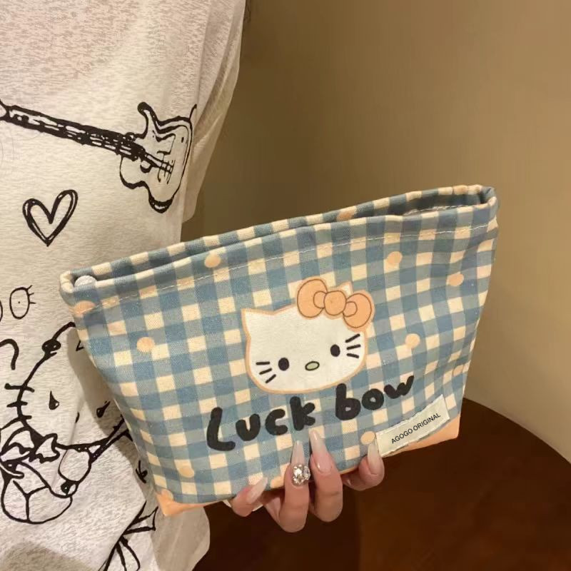 原创设计中古kitty猫格子手拿内胆包口红化妆包洗漱收纳袋帆布包