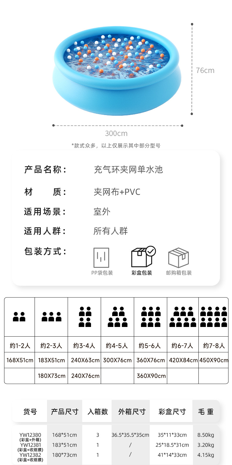 仕様 インフレータブルリングネット シングルプール (168cm*51cm) YW12380,インフレータブルリングネット シングルプール (183cm*51cm) YW12381,インフレータブルリングネット シングルプール (1.80m*73cm) YW12382,インフレータブルリングネット シングルプール (240cm*63cm) YW12383,インフレータブルリングネット シングルプール (240cm*76cm) YW12384,インフレータブルリングクランプネットシングルプール (300cm*76cm) YW12385,インフレータブルリングクランプネットシングルプール (360cm*76cm) YW12386,インフレータブルリングクランプネットシングルプール (360cm*90cm) YW12387,インフレータブルリングクランプネットシングルプール (420cm*84cm) YW12388,インフレータブルリングクランプネットシングルプール (450cm*90cm) YW12389