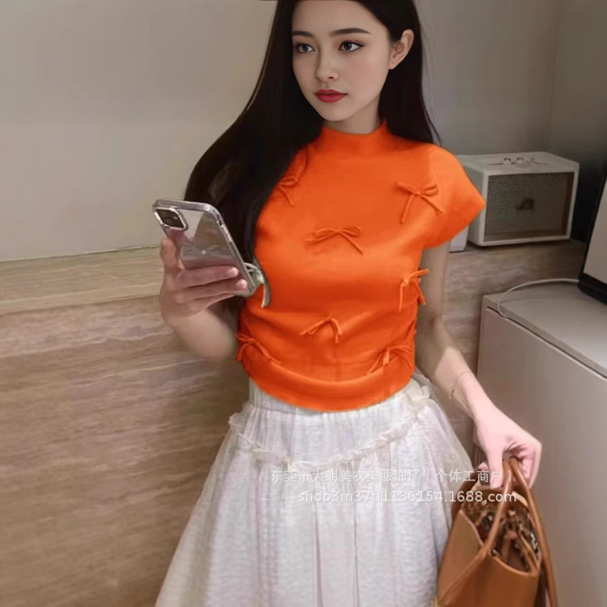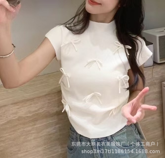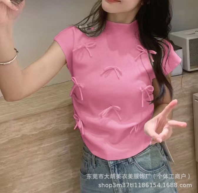 气质甜美芭蕾风蝴蝶结半高领短袖T恤女修身显瘦短款粉色上衣打底