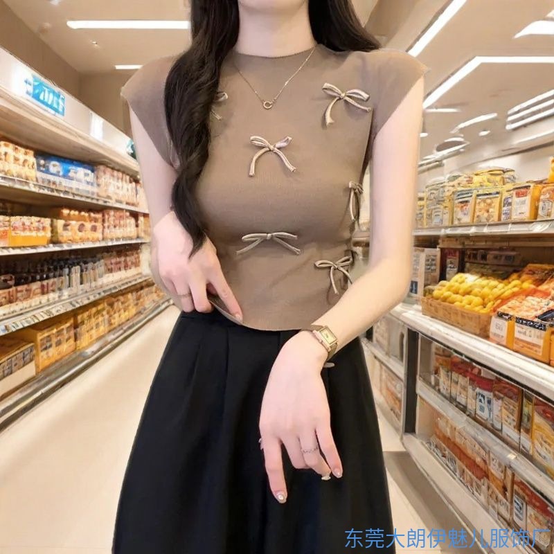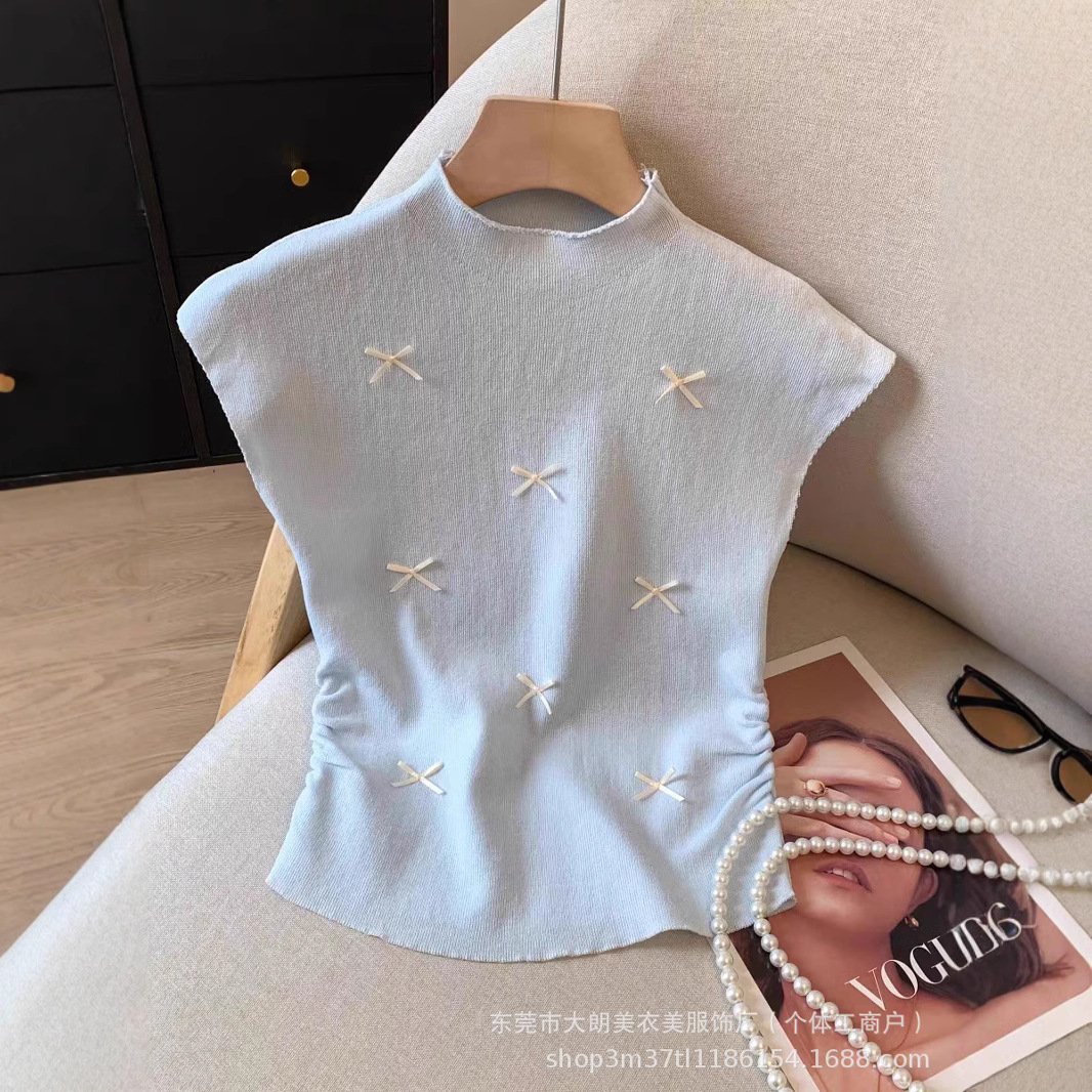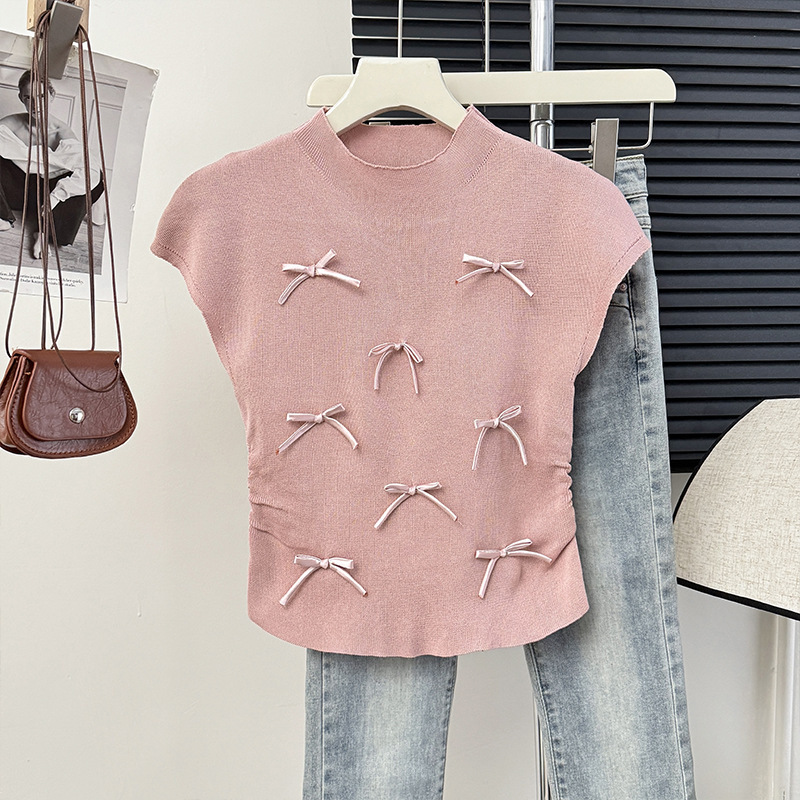 優しいピンクの立体リボン半袖ニットベスト女性用夏デザインプリーツスモールフライングスリーブトップトレンディ