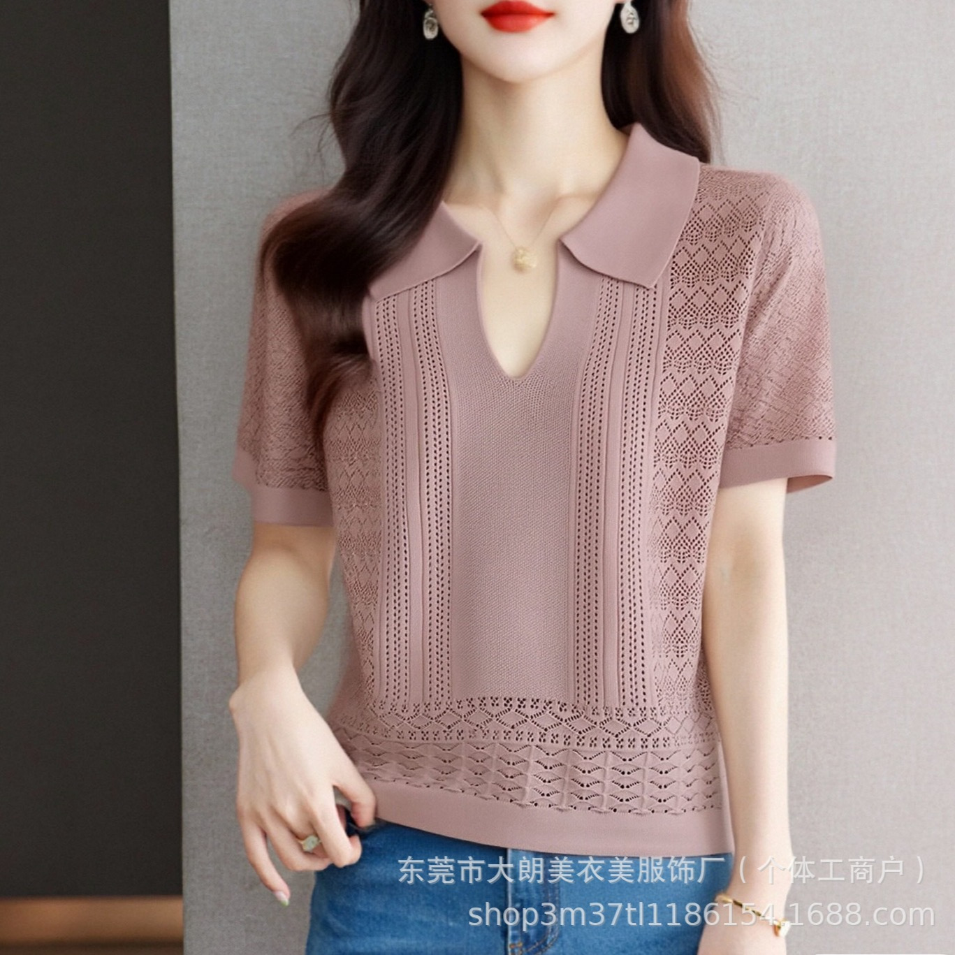2025新款夏季设计感镂空翻领短袖针织衫女独特别致小众短袖上衣潮