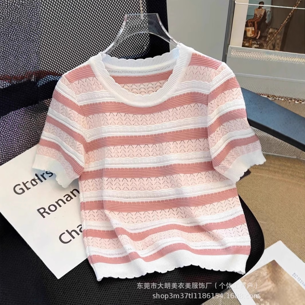 2025新型の修身ヨーロッパ商品の氷糸のストライプのニットの女性の半袖の夏はやせているギャルの短いタイプの底の上着を現します。