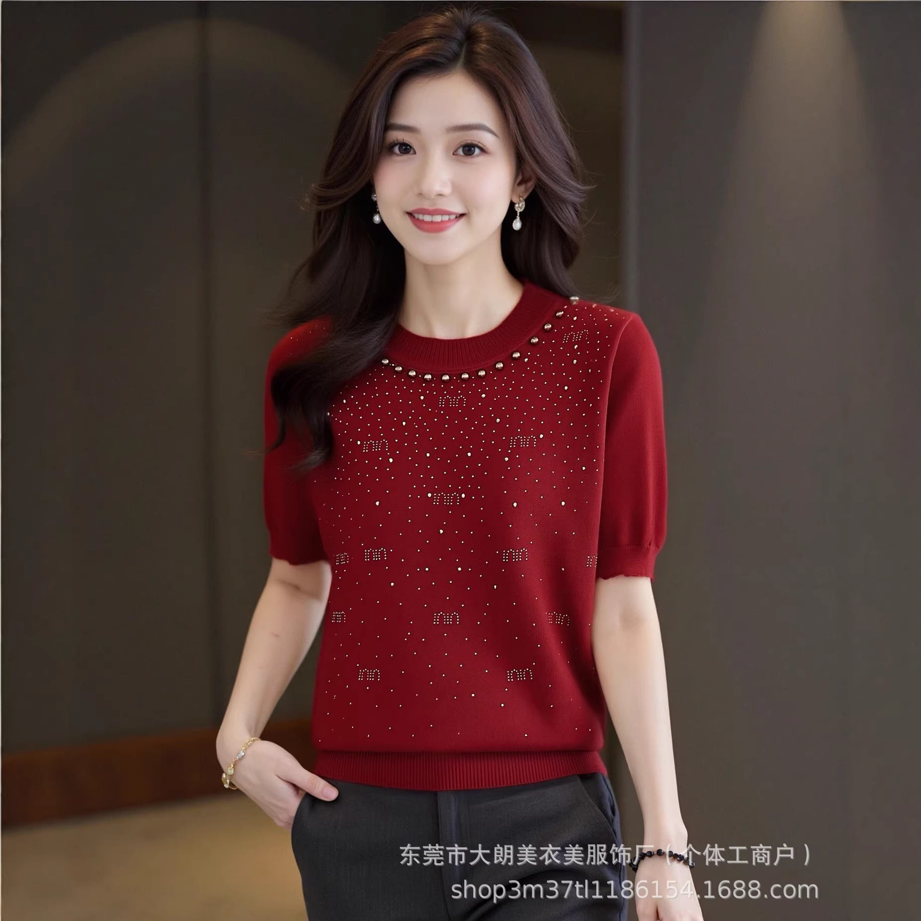 夏季新款冰丝圆领重工镶钻短袖女宽松百搭半袖打底套头气质上衣