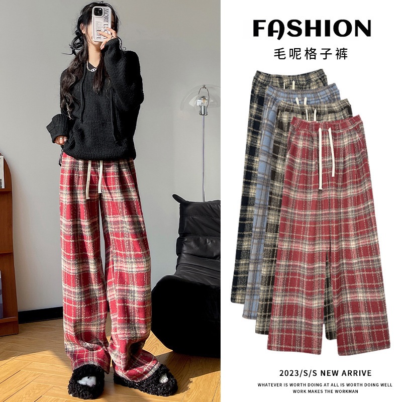 毛呢格子阔腿裤慵懒风加绒女裤秋冬季时尚窄版高腰拖地直筒休闲裤