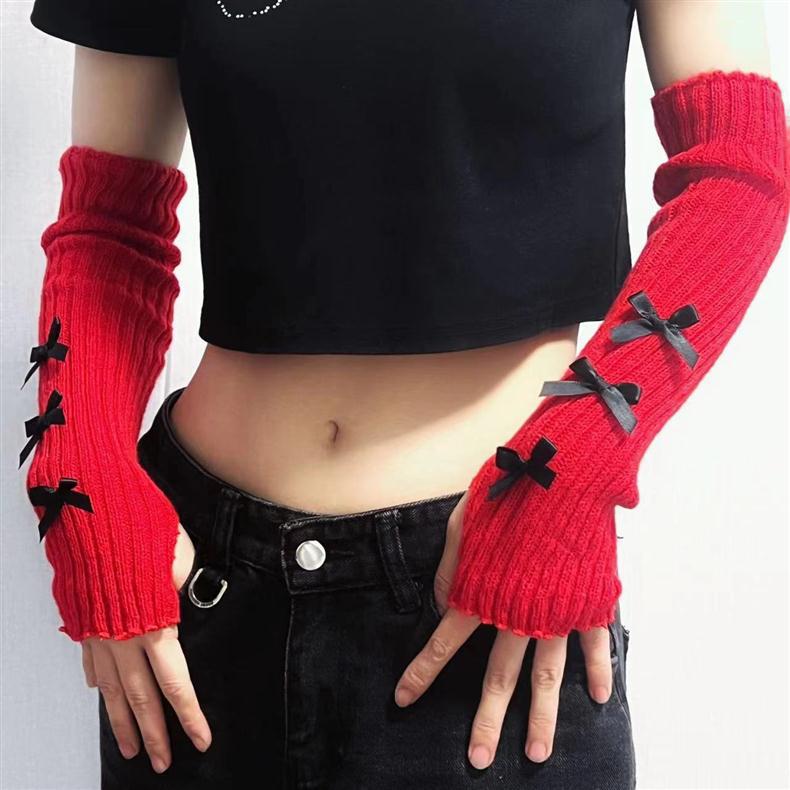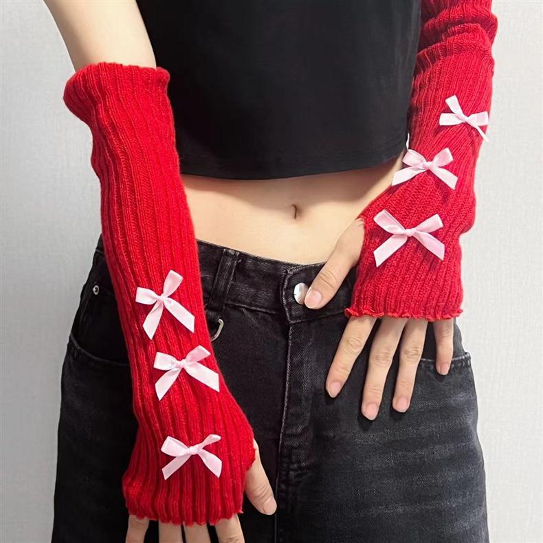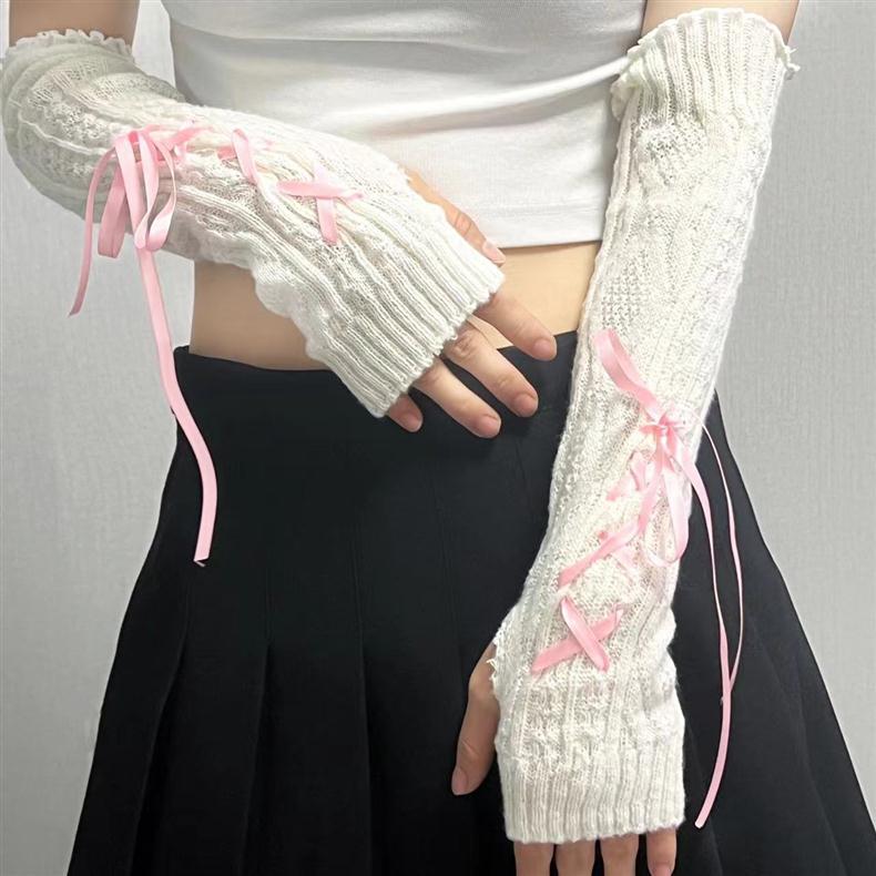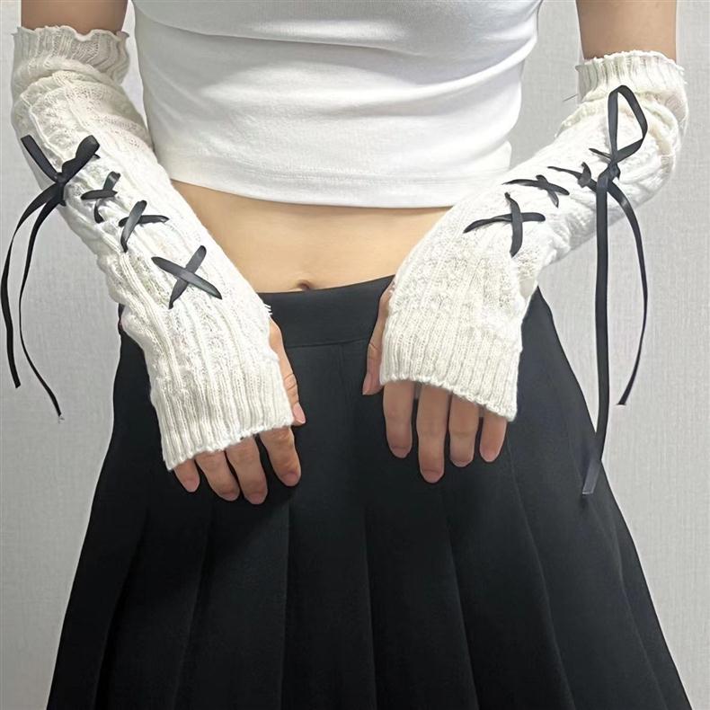 蝶結びの袖の女性の日系lolitaの甘い風の秋冬のニットの毛糸の長いタイプの保温は半分の指の手袋を厚くします。
