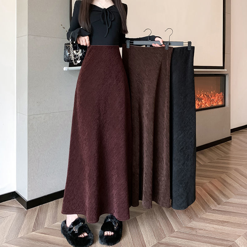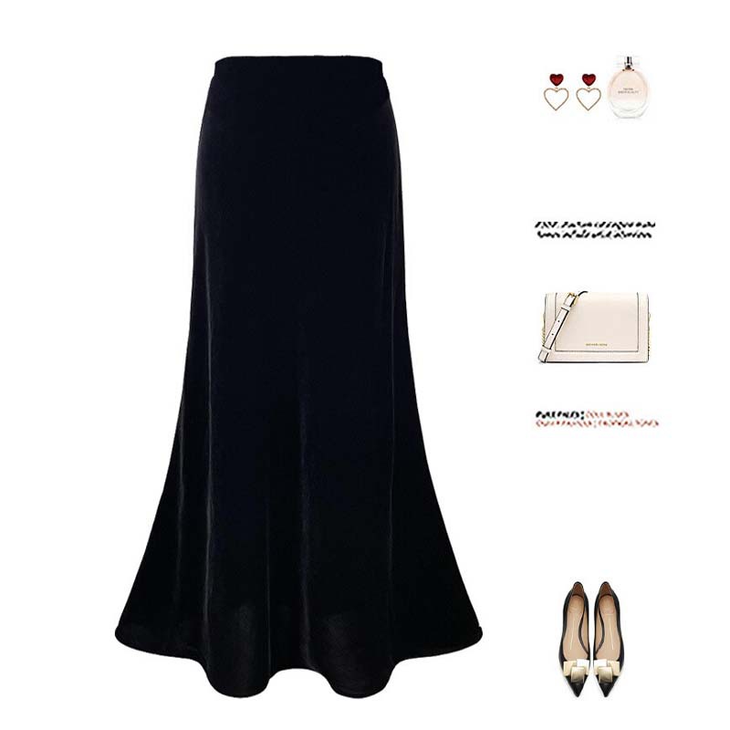 黒の金糸ベルベットスカート レディース 秋冬 ジッパー付き ハイウエスト ミディアム丈 Aライン ヒップカバー フィッシュテールスカート 厚手 保温