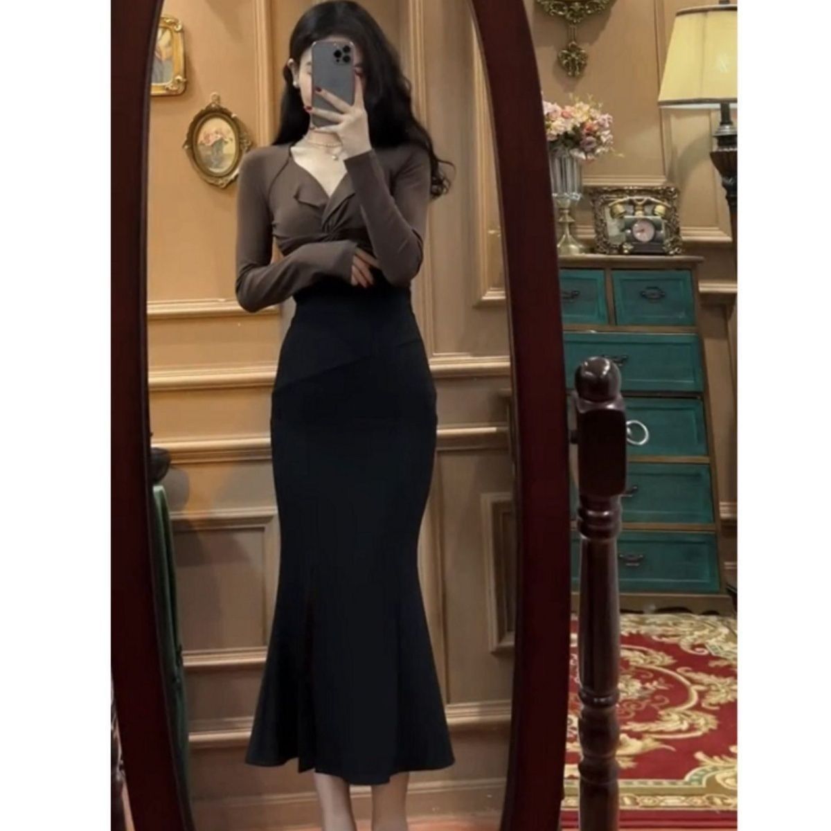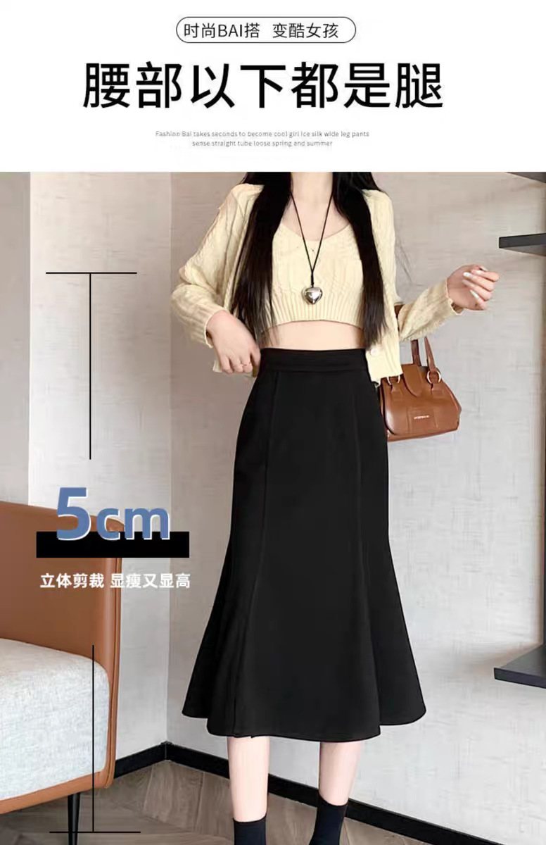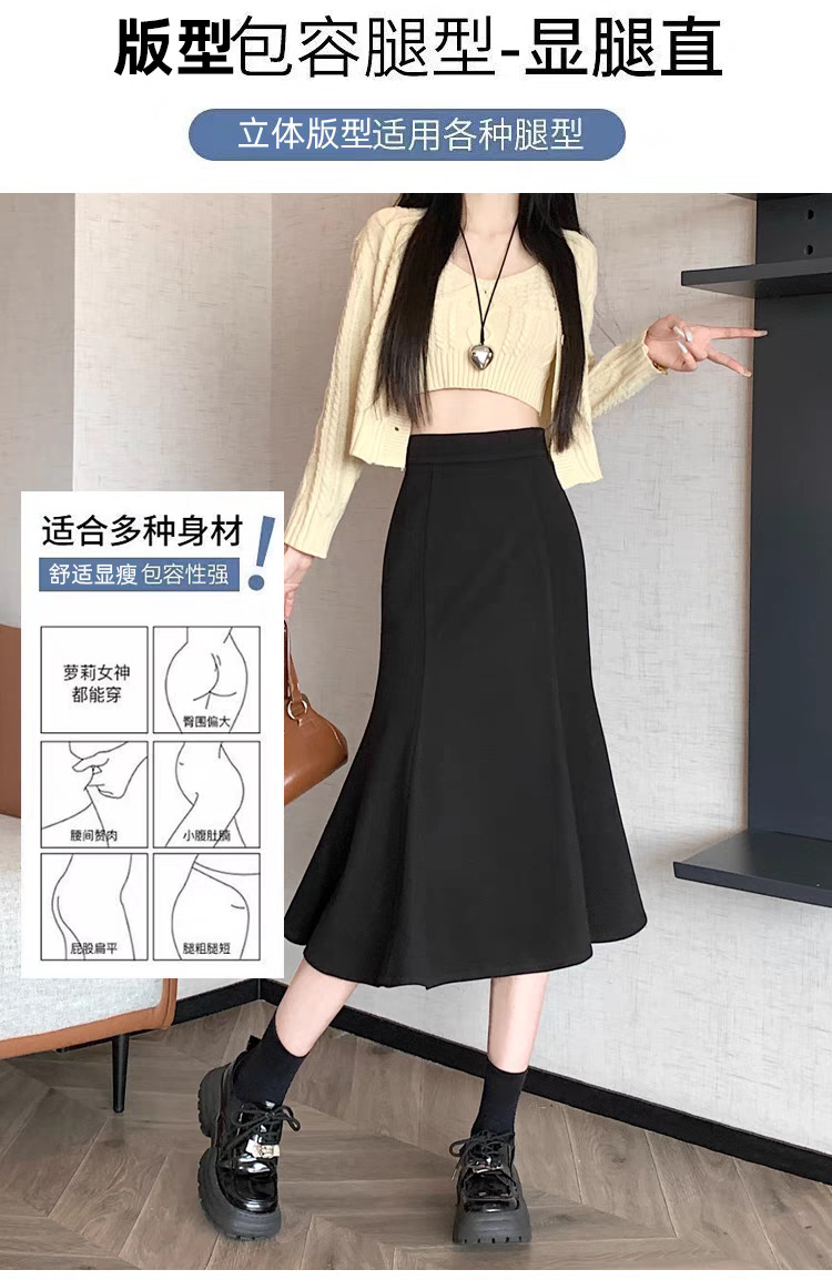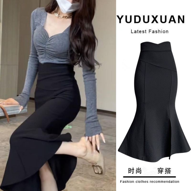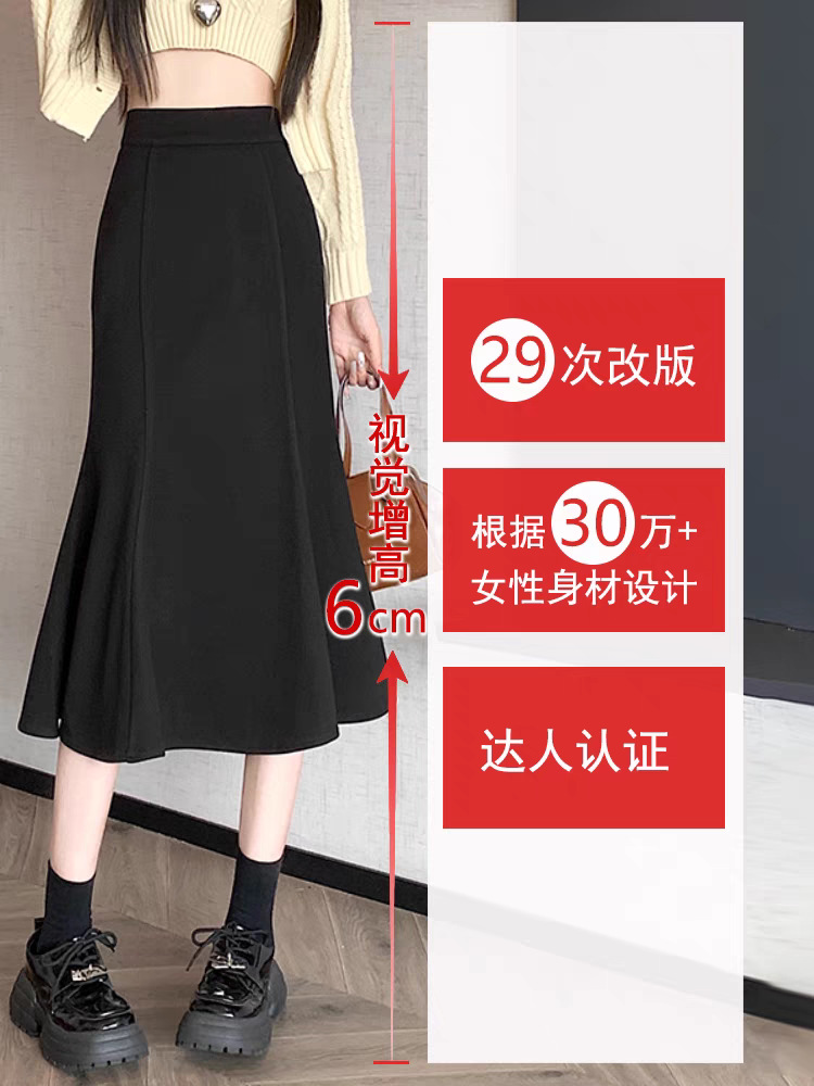 开叉鱼尾半身裙女秋冬新款包臀显瘦高腰法式黑色鱼尾裙中长款裙子