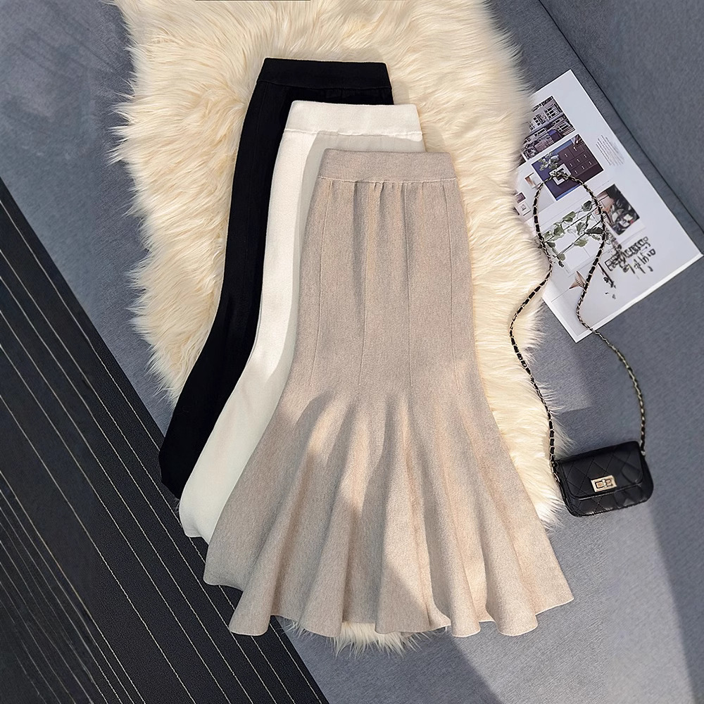 白色鱼尾针织半身裙女秋冬新款包臀步步生莲半裙止步长裙小个子