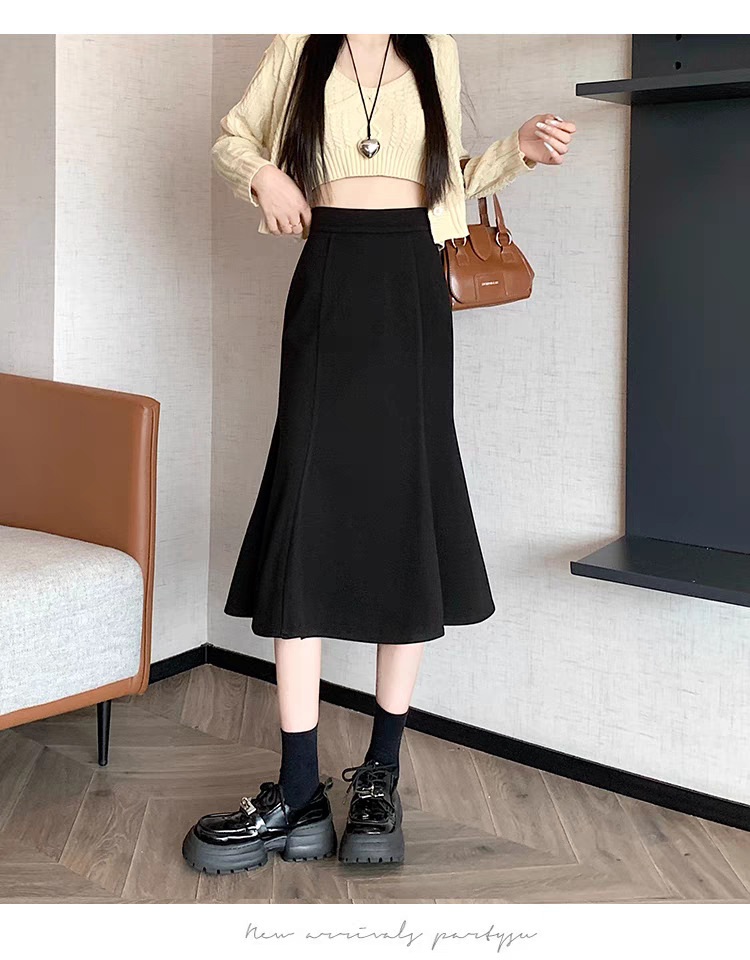 黑色毛呢半身裙女秋冬季高腰显瘦中长款百搭裙小个子高级感鱼尾裙