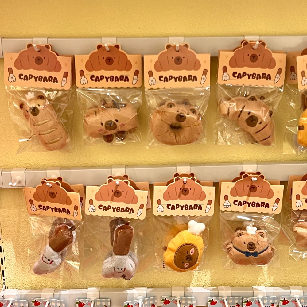 テン億オリジナルグルメ豚のぬいぐるみのペンダントが可愛いぬいぐるみのキーホルダーにぶら下がっています。