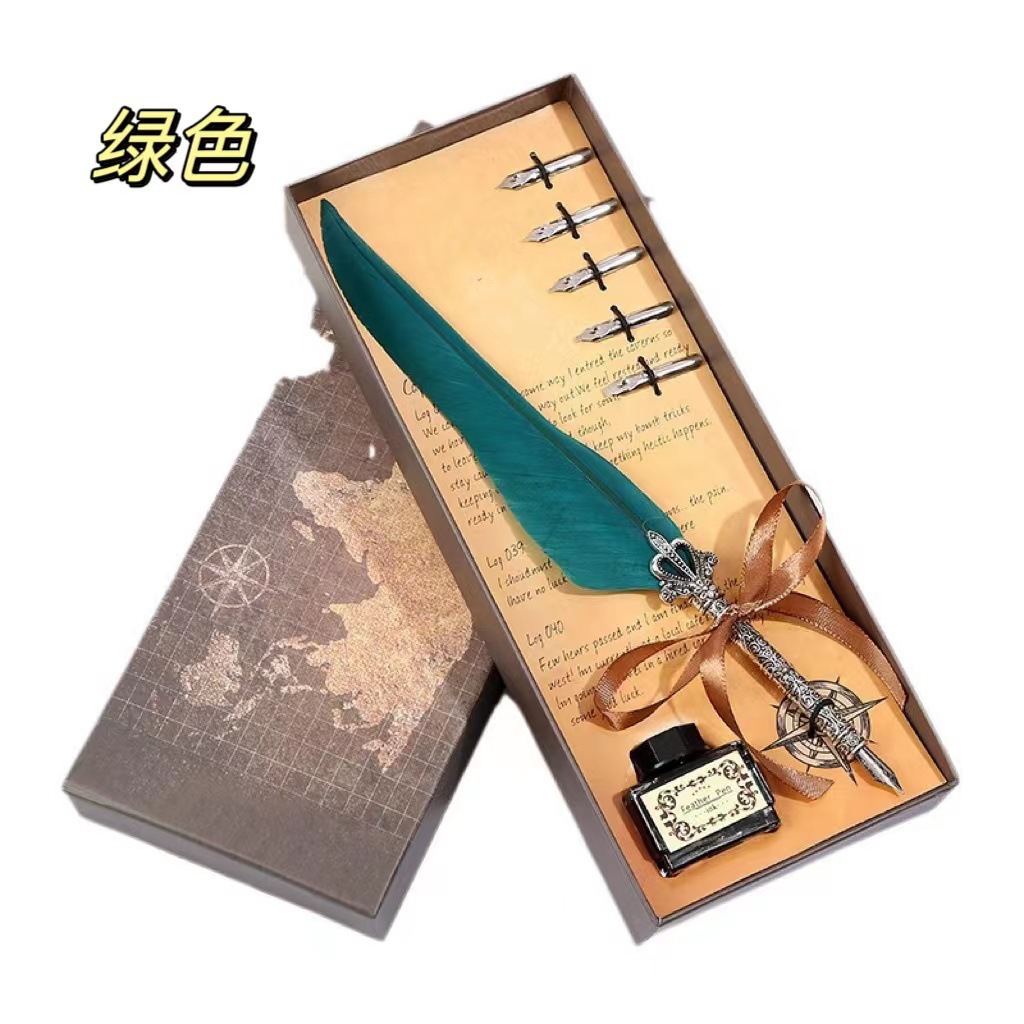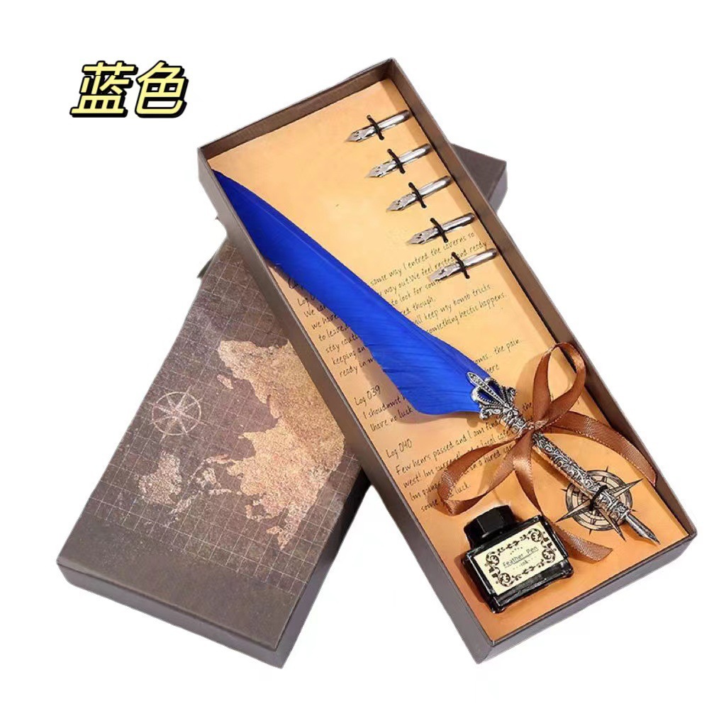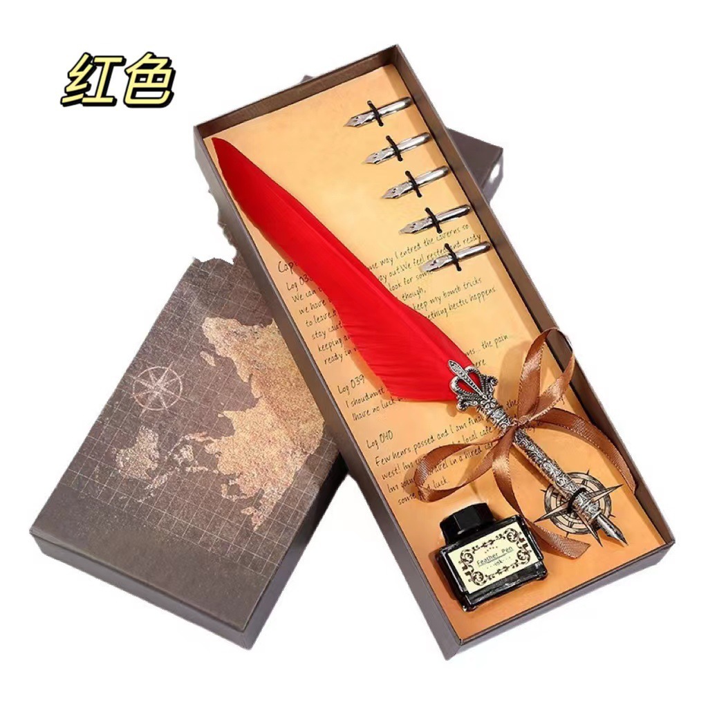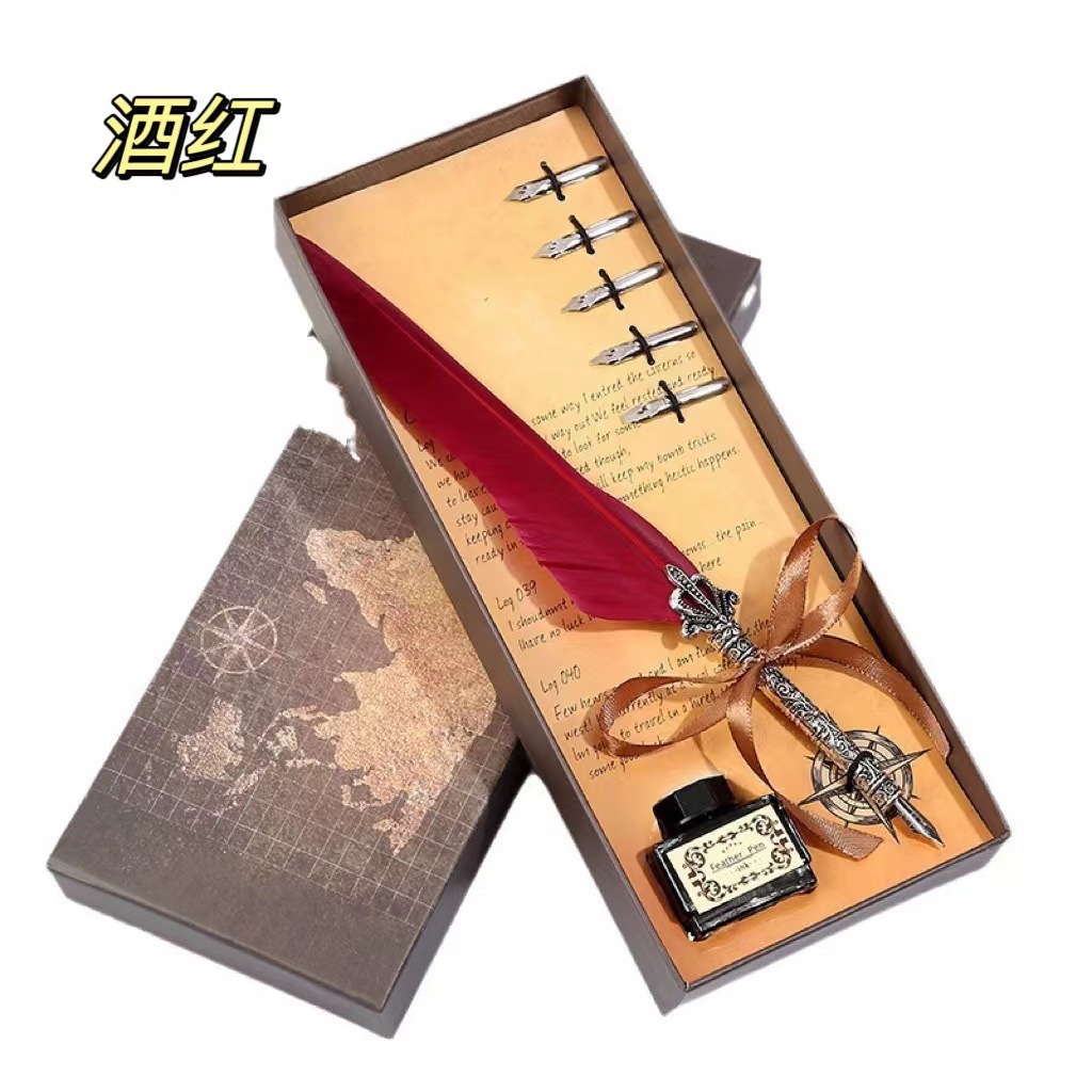 レトロな地図の羽の筆のギフトボックスの彫刻の台座の万年筆のセットは水の万年筆をつけて台座を持ってカスタマイズできます。