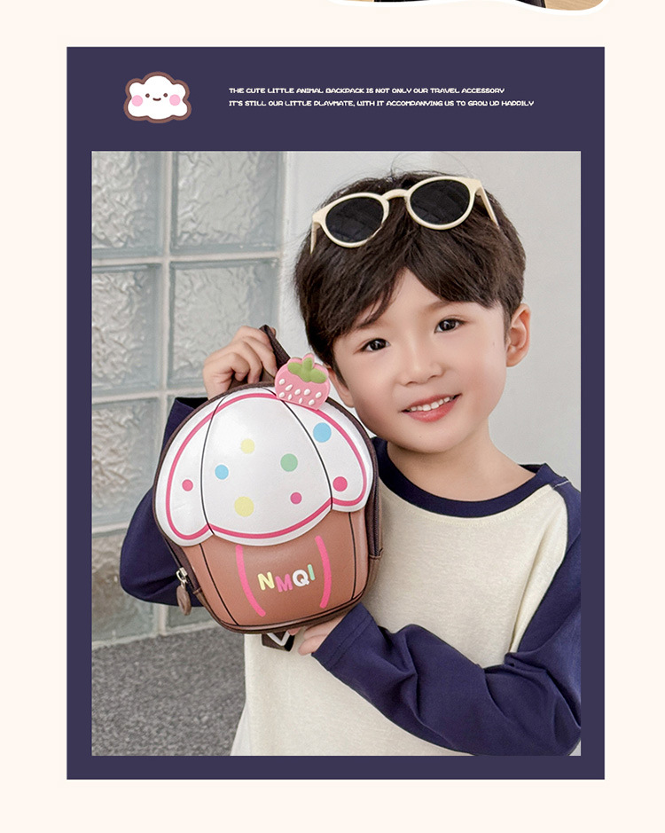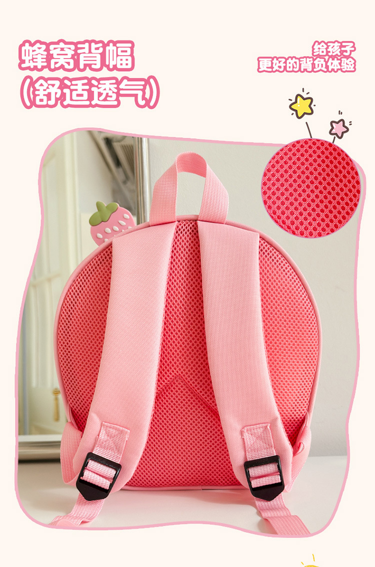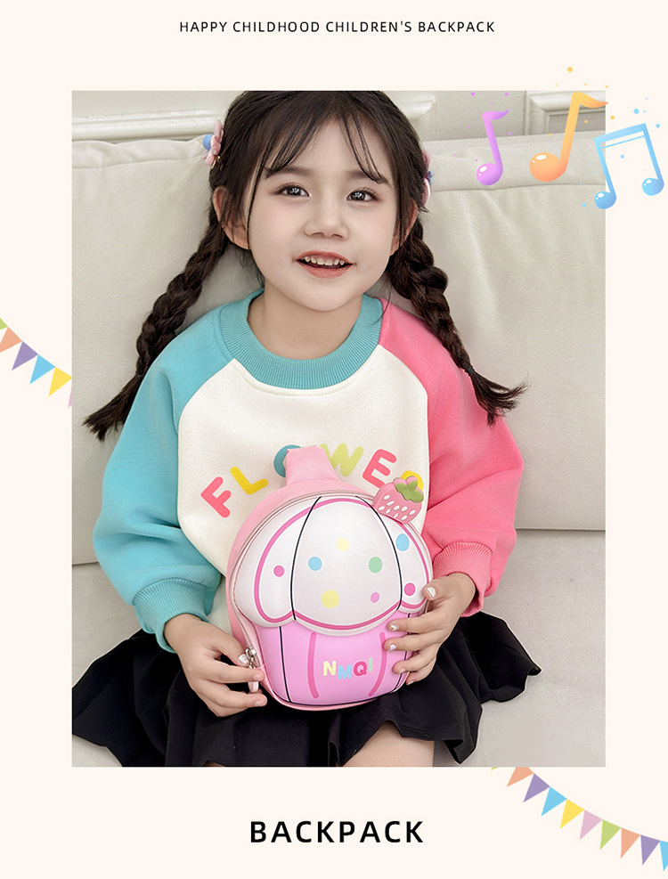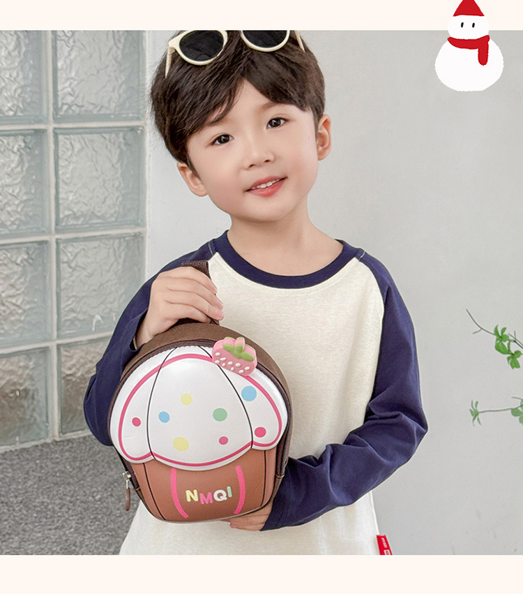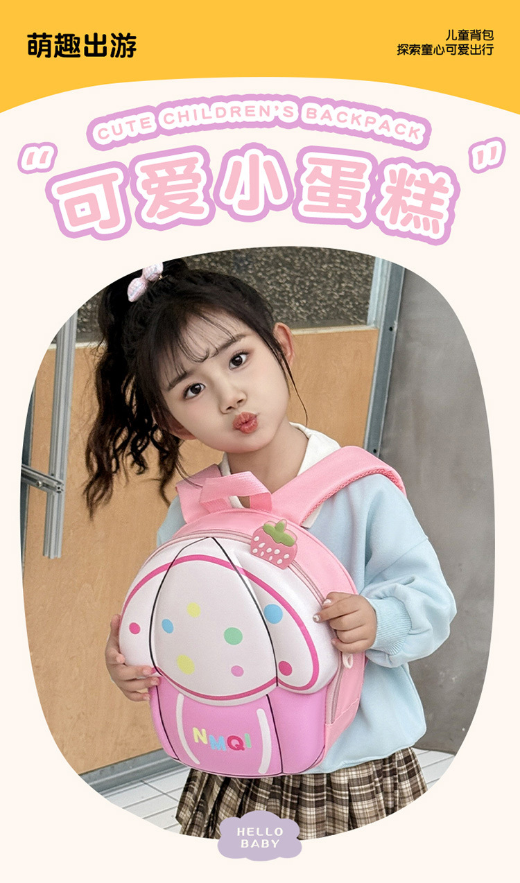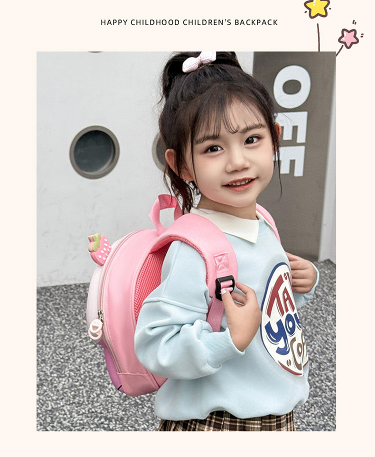 子供の幼稚園の入学のイチゴのケーキのかばんの小さい女の子の男の子の胸は漫画のかわいい小さいクラスの卵の殻のリュックサックを包みます。