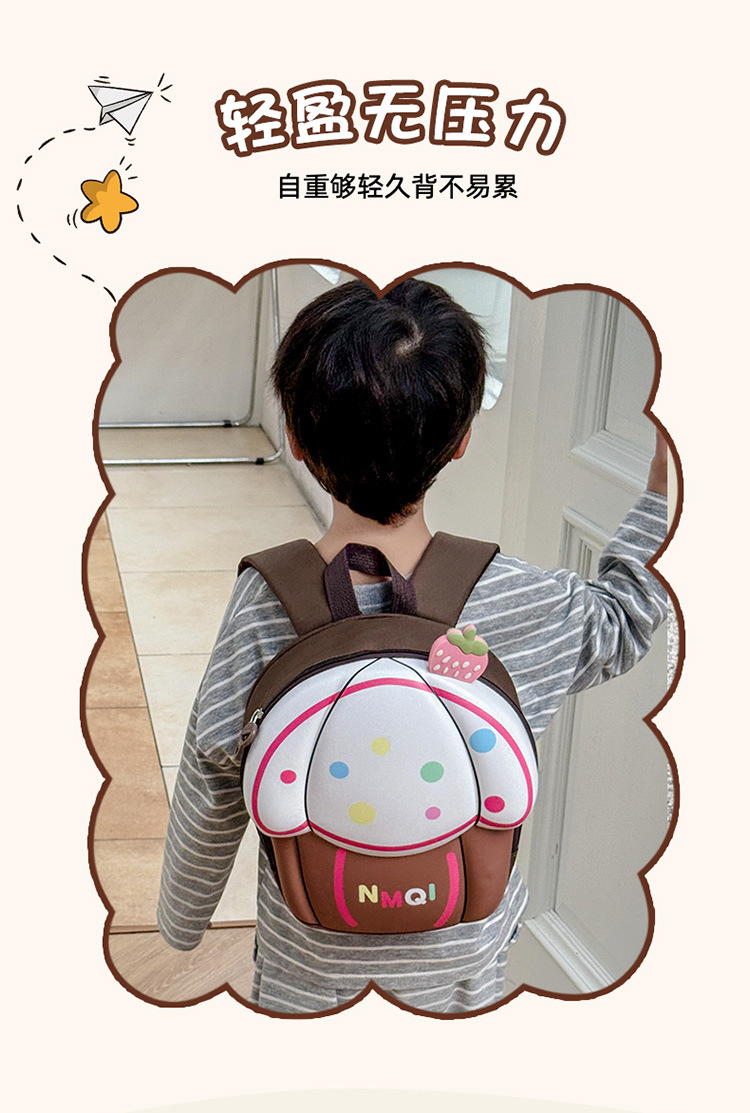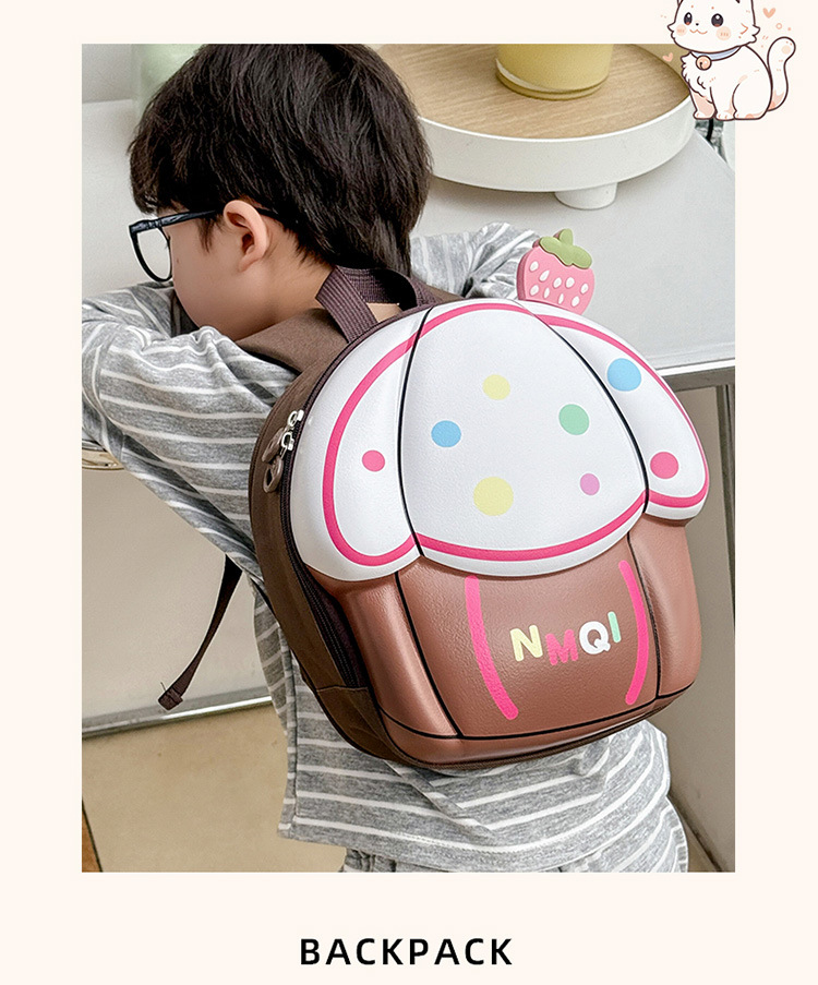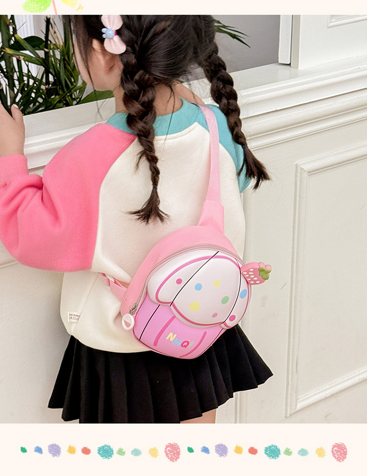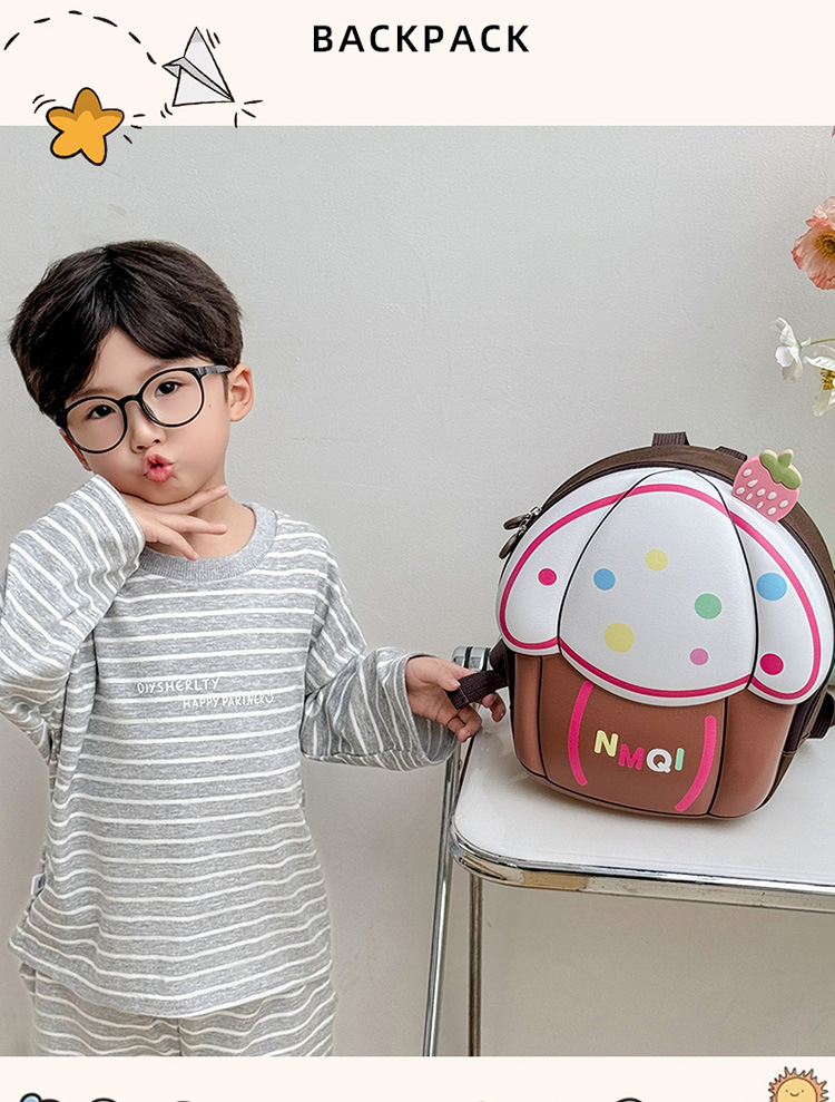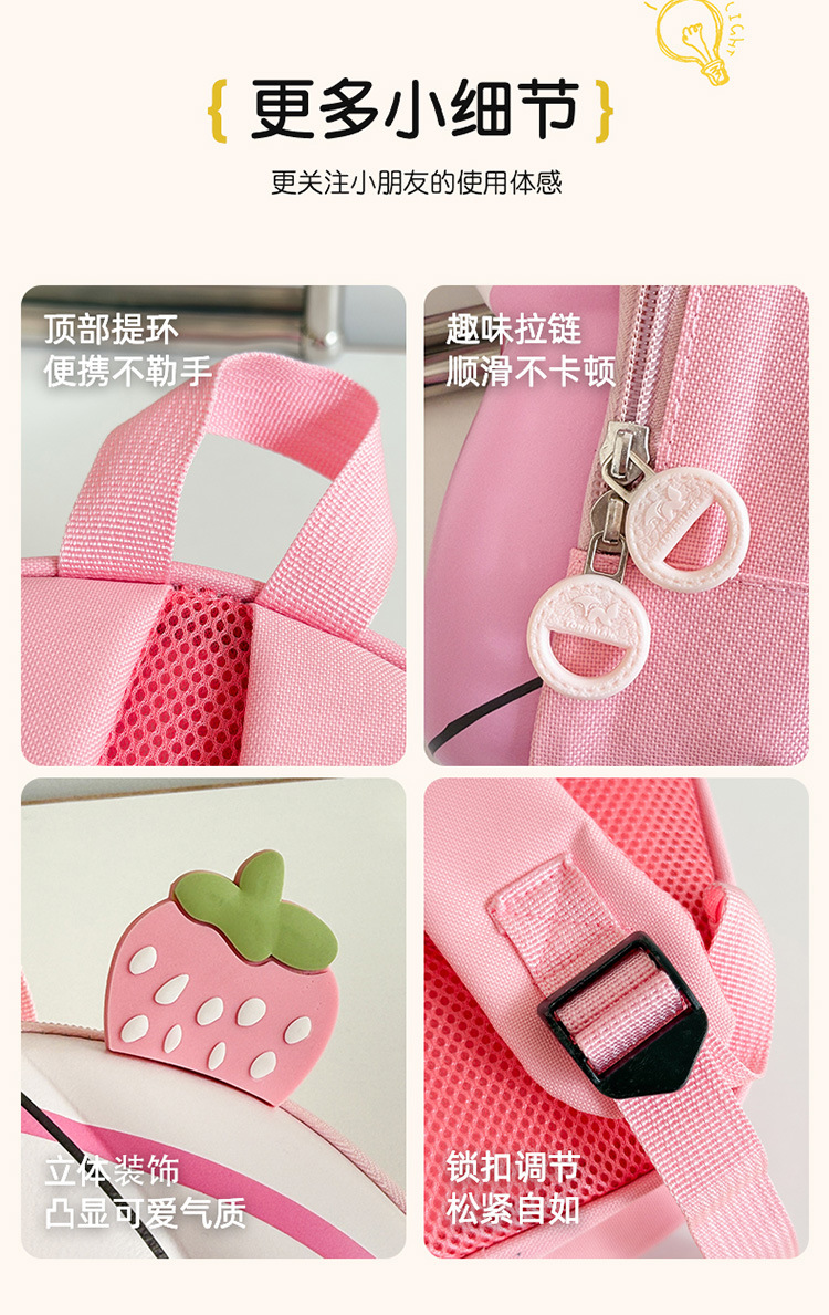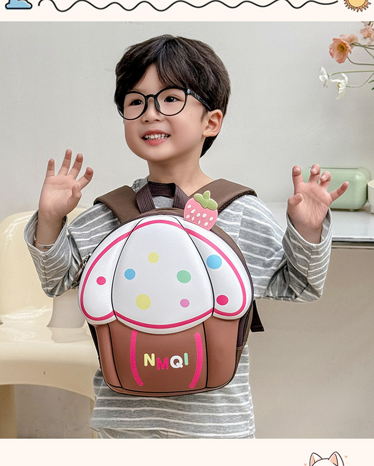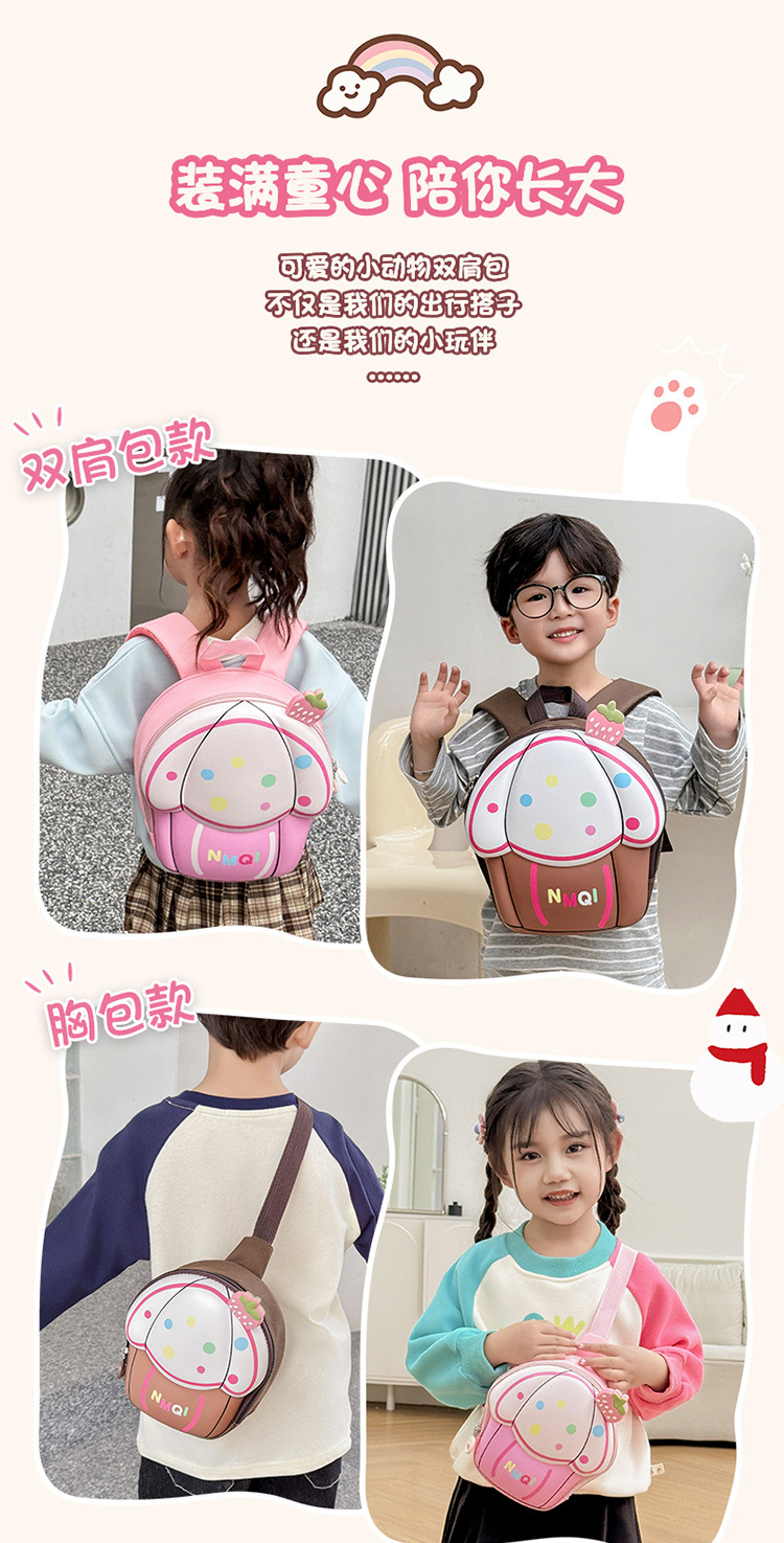 子供の幼稚園の入学のイチゴのケーキのかばんの小さい女の子の男の子の胸は漫画のかわいい小さいクラスの卵の殻のリュックサックを包みます。