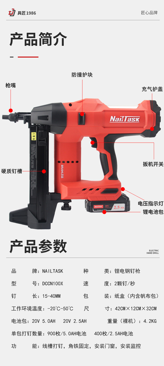 Nail taskリチウム電気鋼釘銃電動釘銃プラスチック列釘銃水力発電ガス釘器釘銃