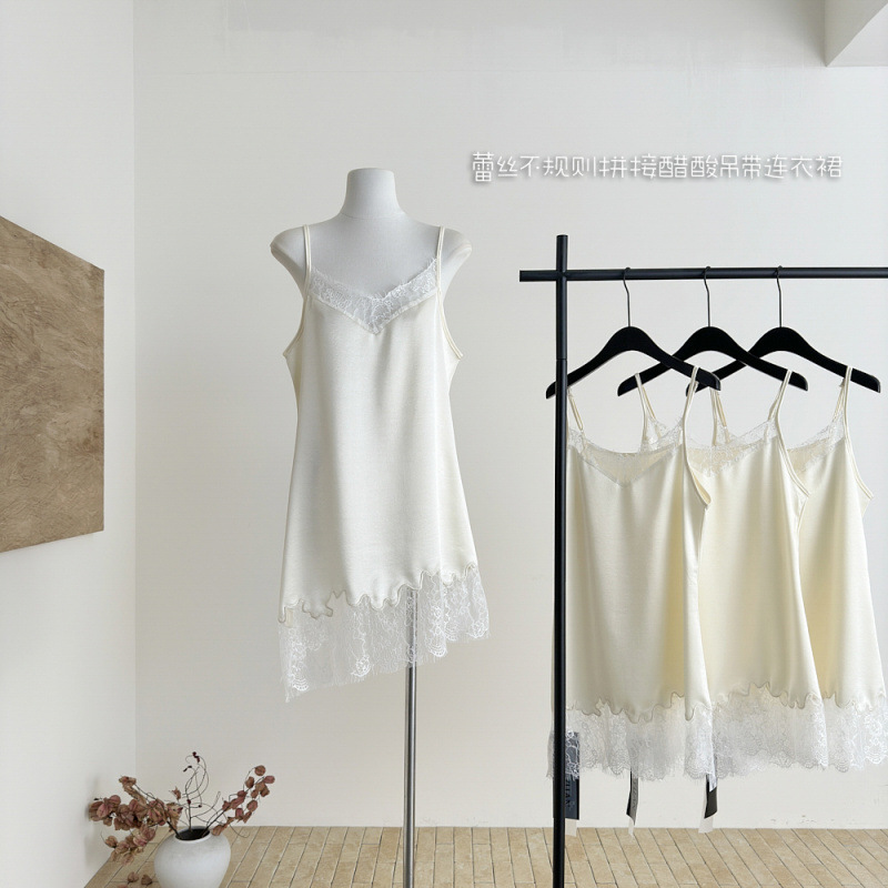 白色蕾丝不规则拼接醋酸吊带连衣裙女可叠穿内搭裙子