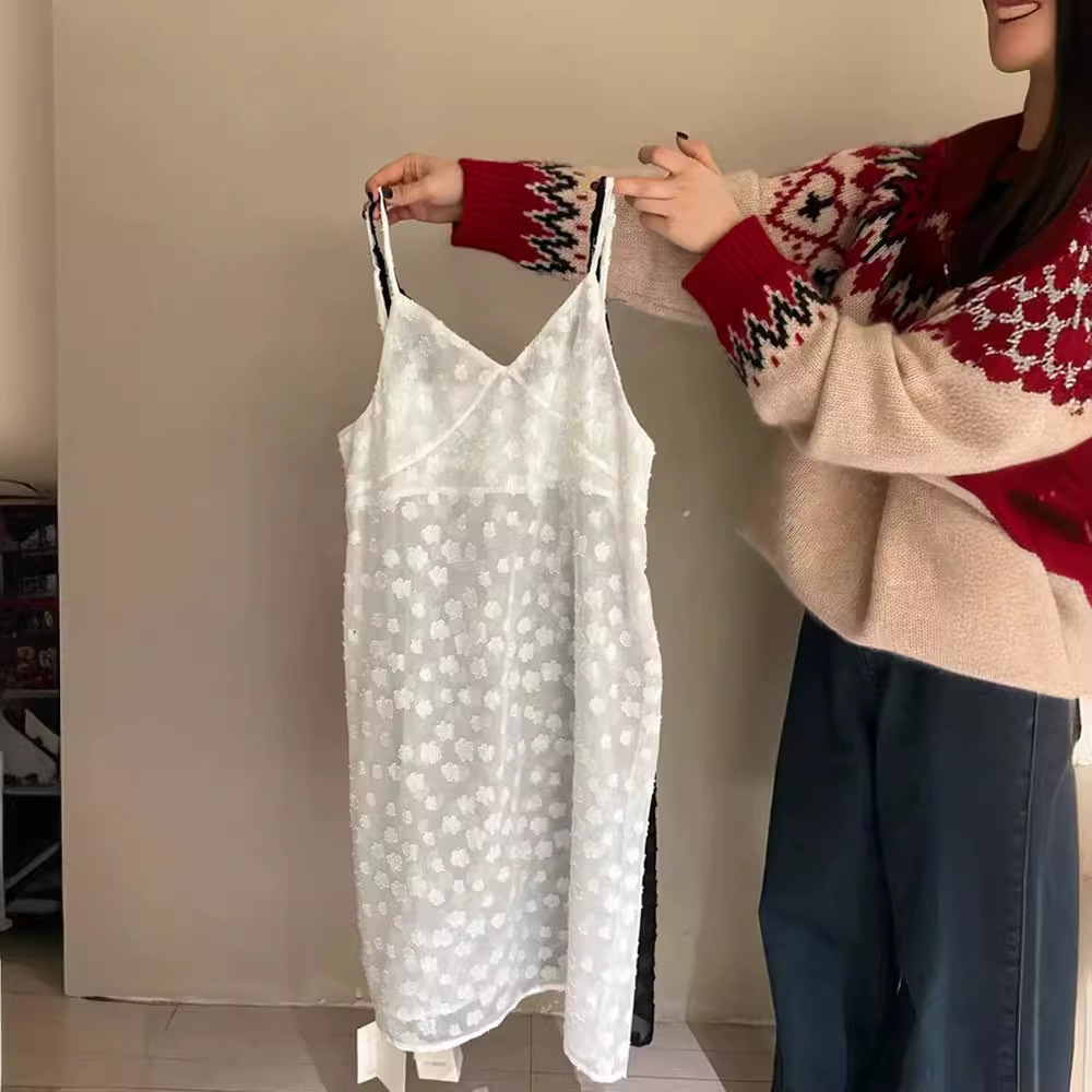 フレンチスイートインかぎ針編みVネックレースベストドレスアプリコットベストドレスレースボトムドレス