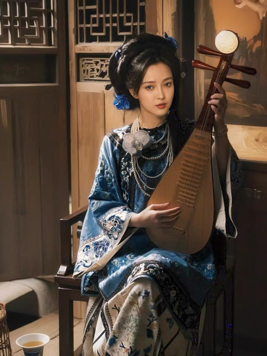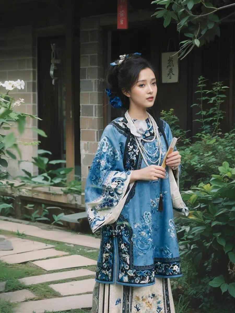 清漢の女性晋商の若いおばあさんの撮影服の丸首の斜めの襟の上着の馬のスカートの清朝の服装の格格の旗の服の青い服