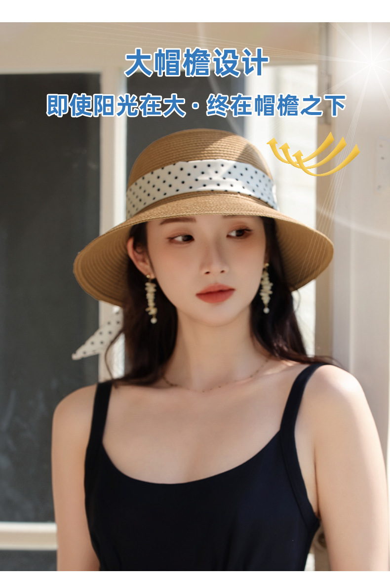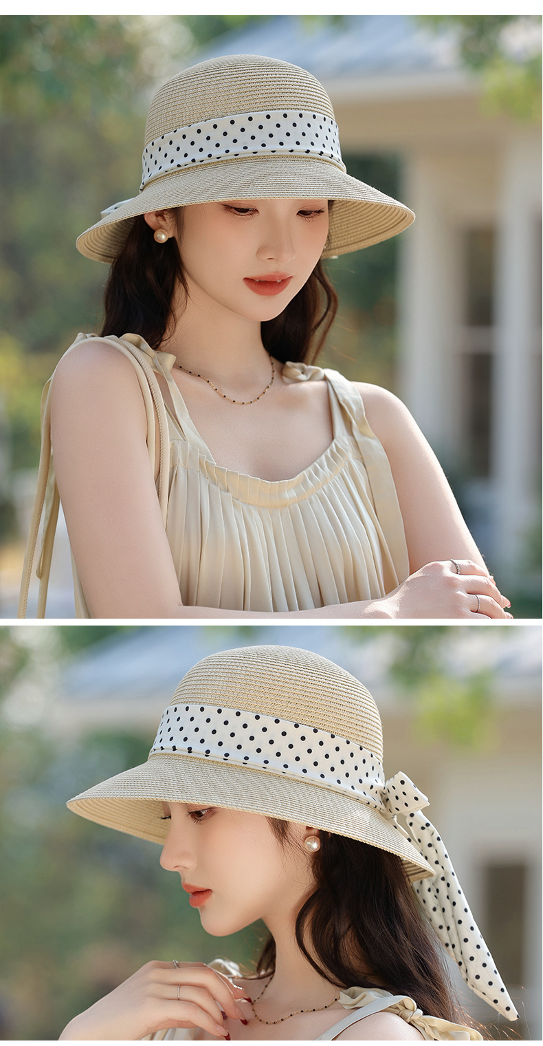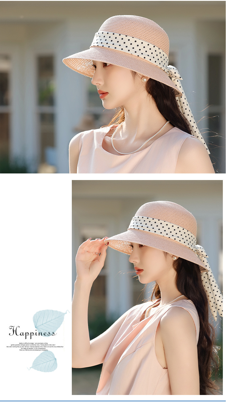フランスの夏の新しい帽子の女性の丸い点のリボンのラフィーの麦わら帽子の日よけの日焼け止めの帽子の通気性の蝶結びは顔が小さいです。