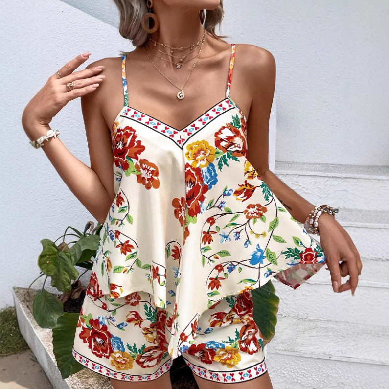 2025年クロスボーダー外国貿易ヨーロッパとアメリカの花柄ベストとショーツアマゾン休暇服女性用2点セット