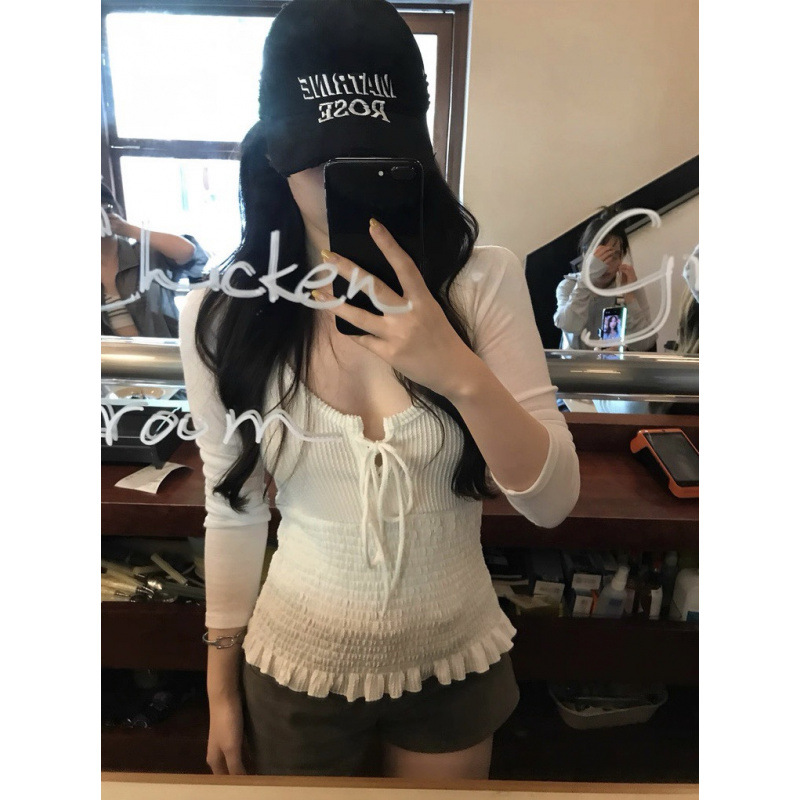 木耳边褶皱掐腰长袖T恤显瘦打底上衣