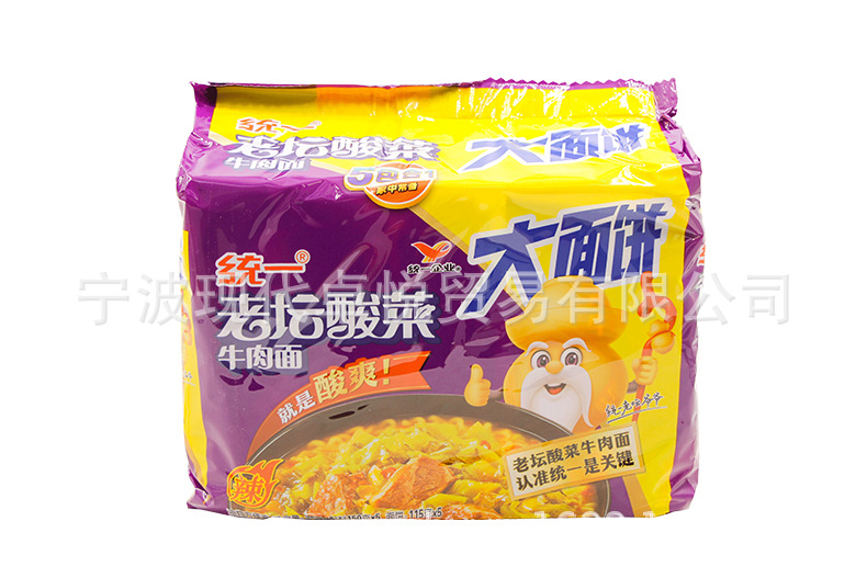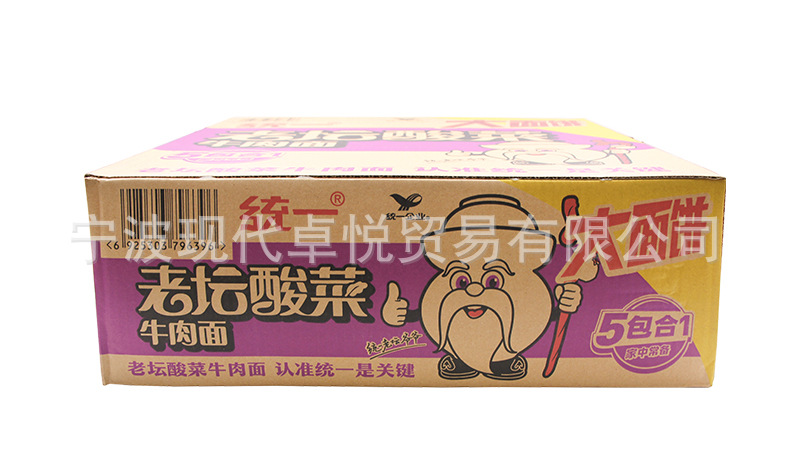 統一五合一の大麺のインスタントラーメンの箱の中に古い祭壇の酸っぱい野菜を詰めます。