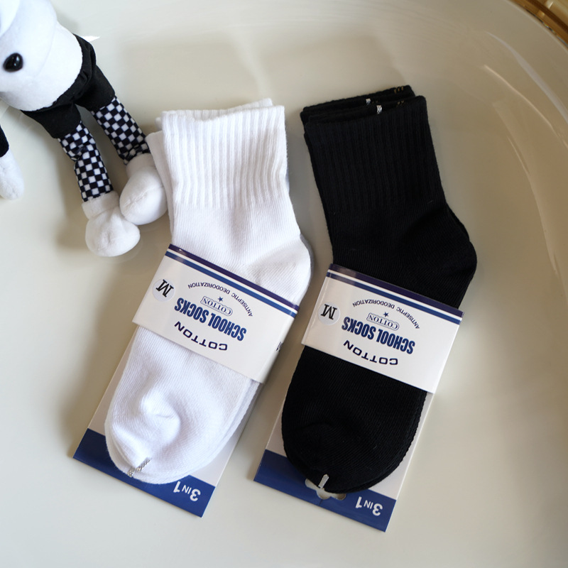 高級子供用靴下、黒と白の靴下、春秋用コーマ綿学生靴下、ミドル丈、男の子と女の子の制服靴下の卸売
