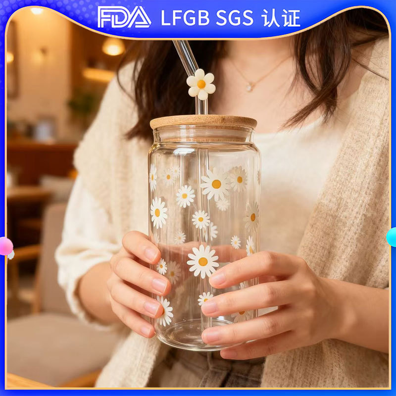 高硼硅玻璃杯吸管杯可爱小雏菊印花可乐杯耐高温不易炸裂跨境包装
