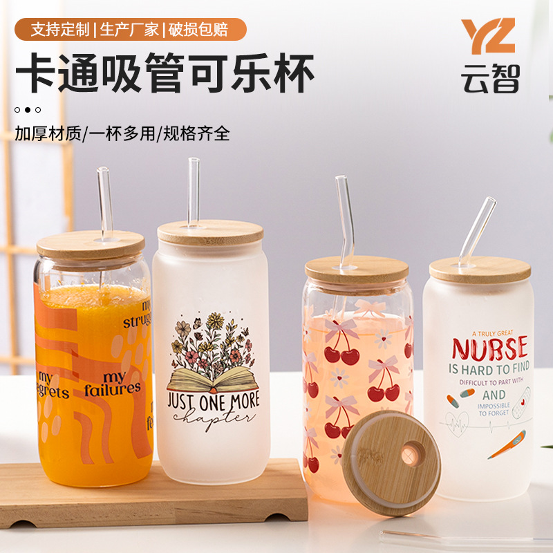 跨境高硼硅玻璃可乐冷饮杯竹木盖带吸管奶茶咖啡杯啤酒果汁饮料杯