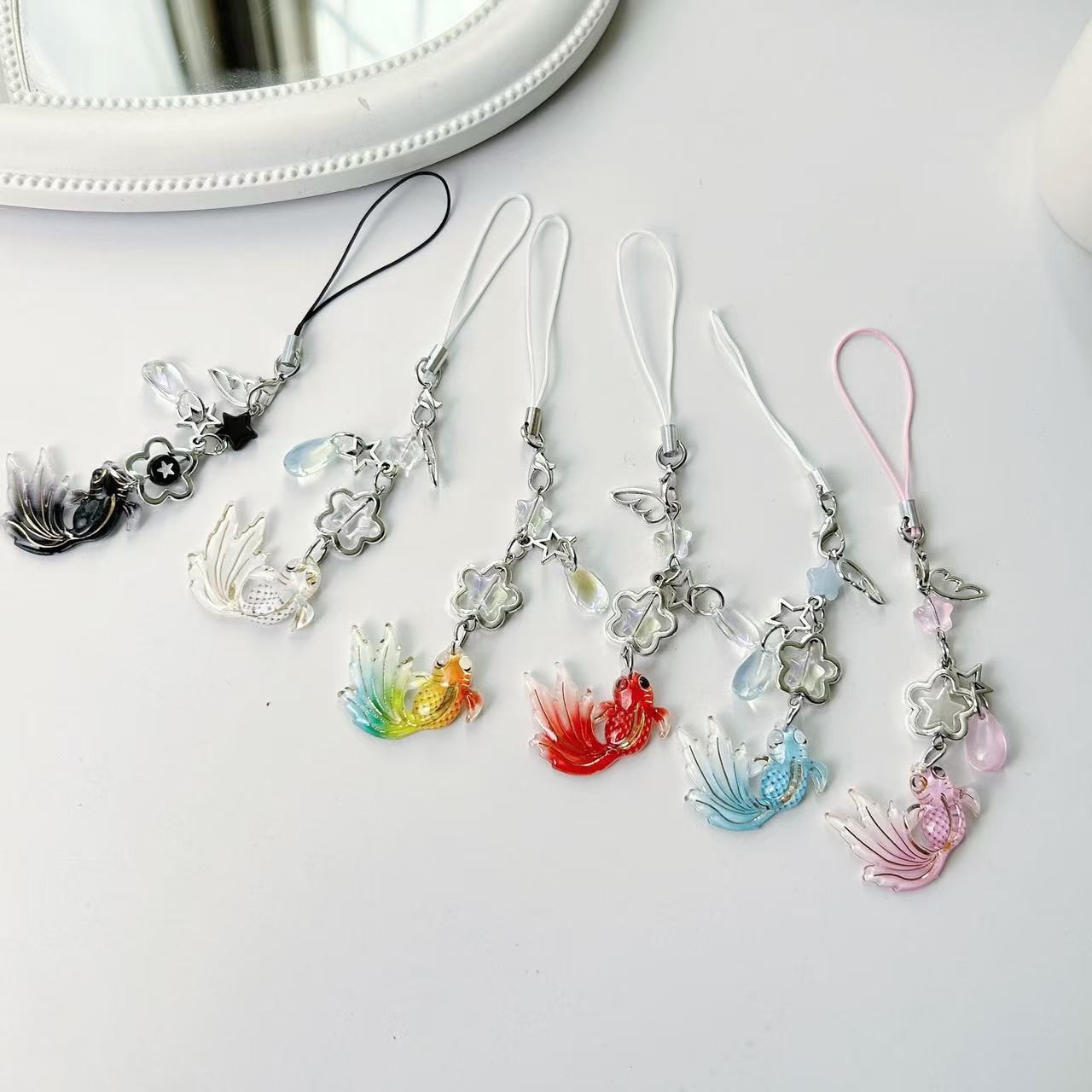 夏の金魚とイルカの手作りビーズチェーン、女の子らしいハンドメイドビーズ携帯ストラップ、ペンダント