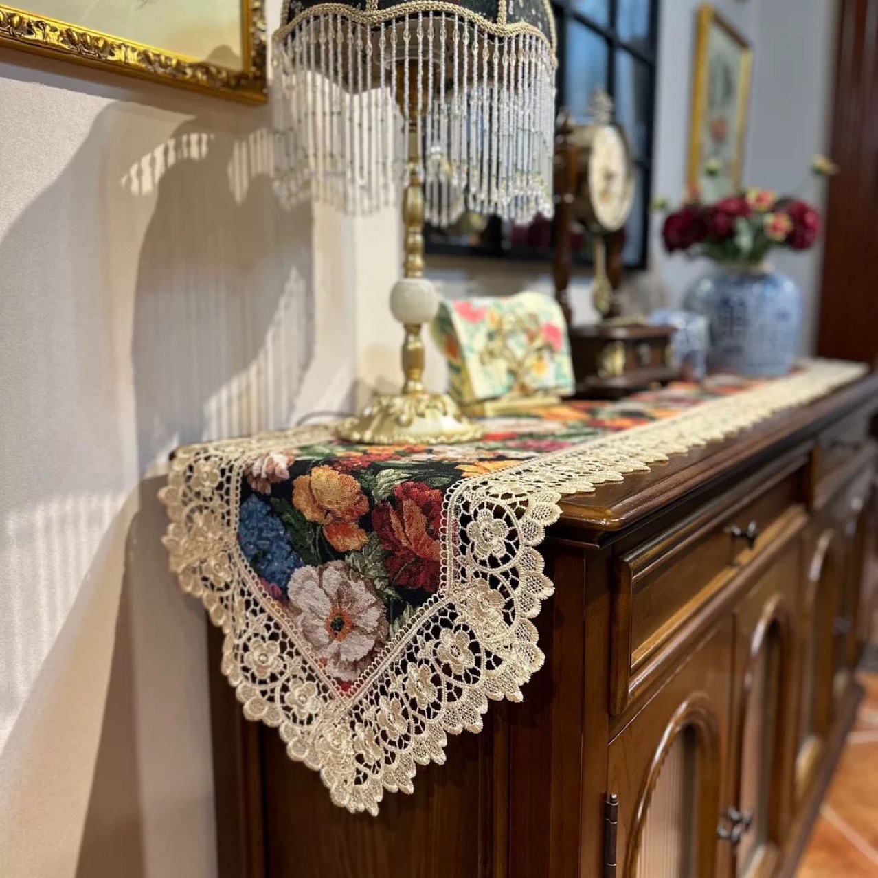 新款桌旗斗柜长条盖布复古镂空桌布茶几鞋柜防尘盖布吊穗花边