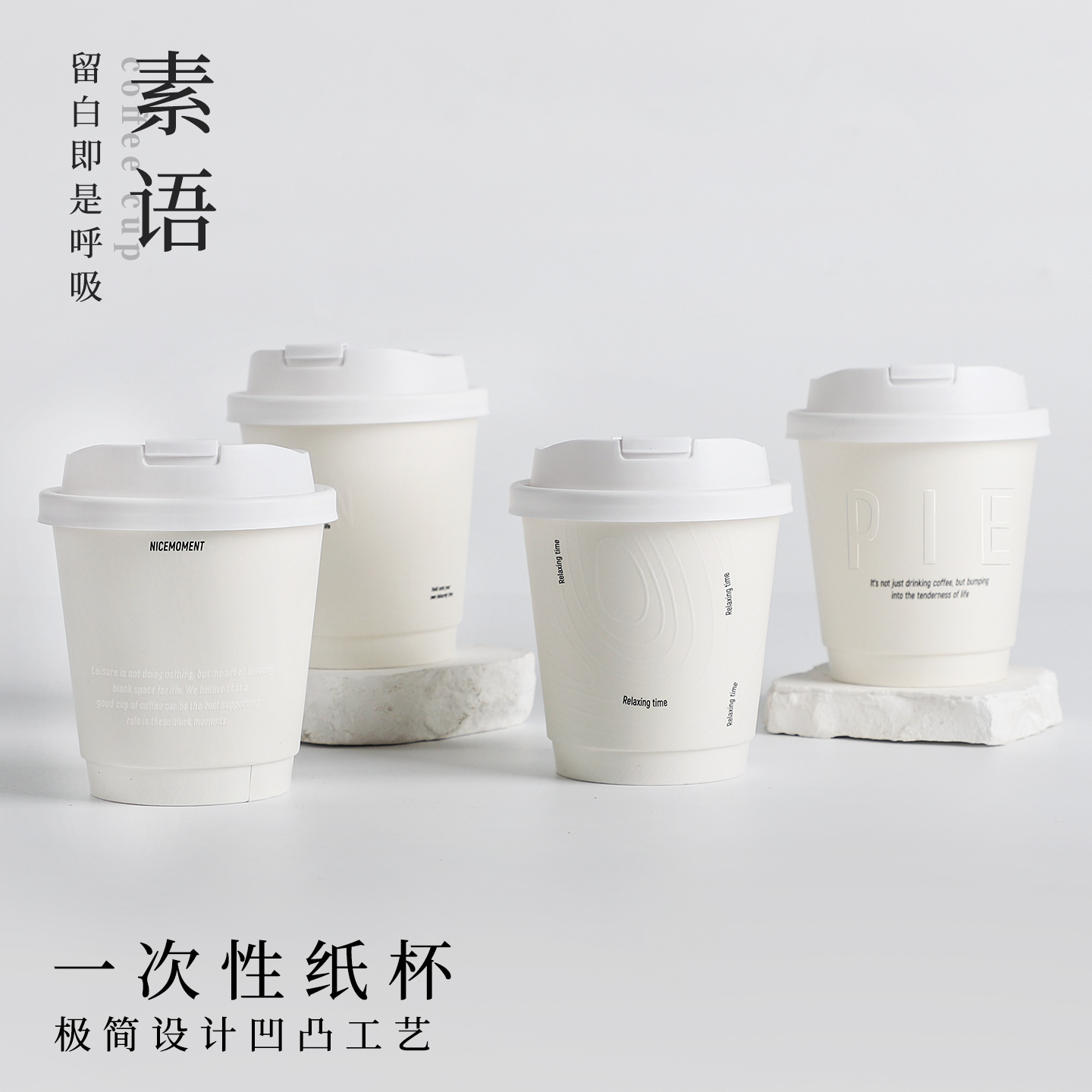 简约白一次性咖啡杯带盖商用打包凹凸纹双层中空防烫热饮纸杯定制