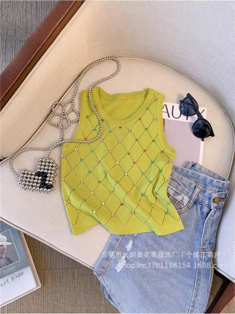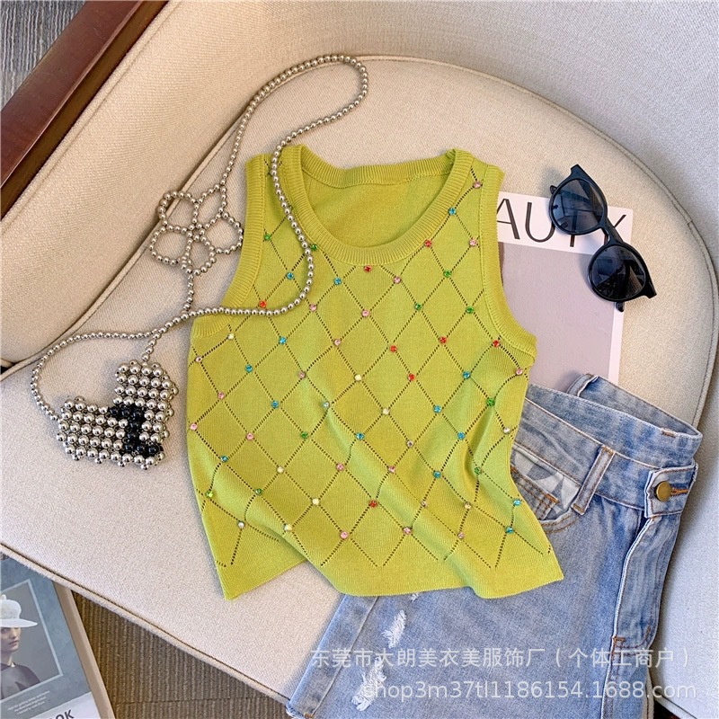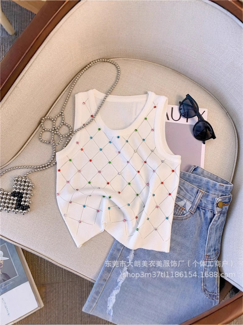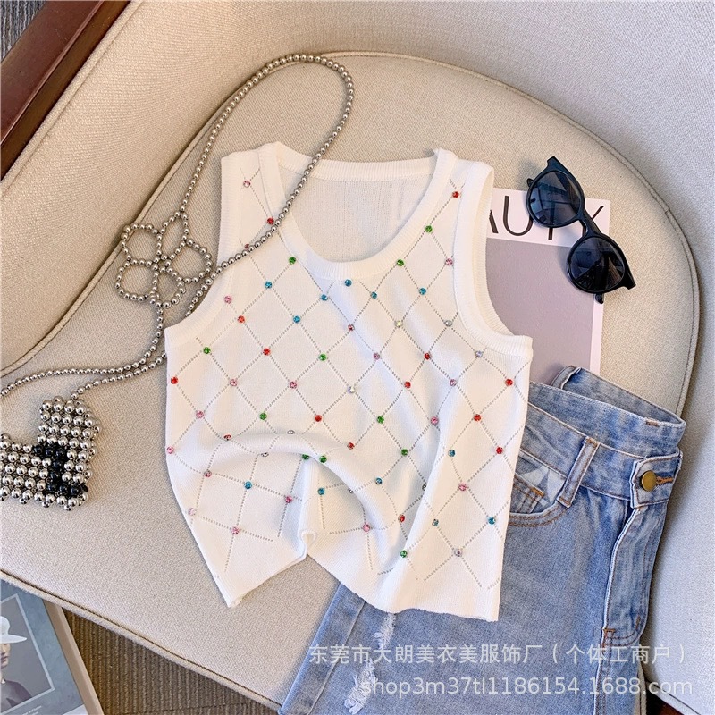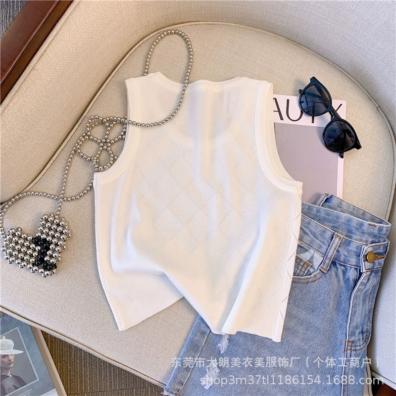 2025夏の新型のホットドリルのギャルの白い香風の袖なしのキャミソールの女性のニットの上着