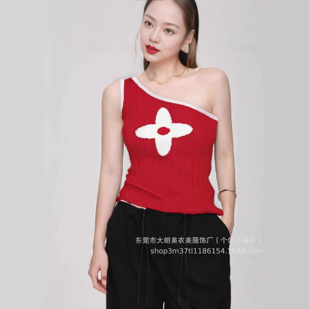 デザインされた斜め肩のコントラストカラーパターンのショートニットトップ、新しいタイトフィットのノースリーブインナーベスト、女性の夏のトレンド