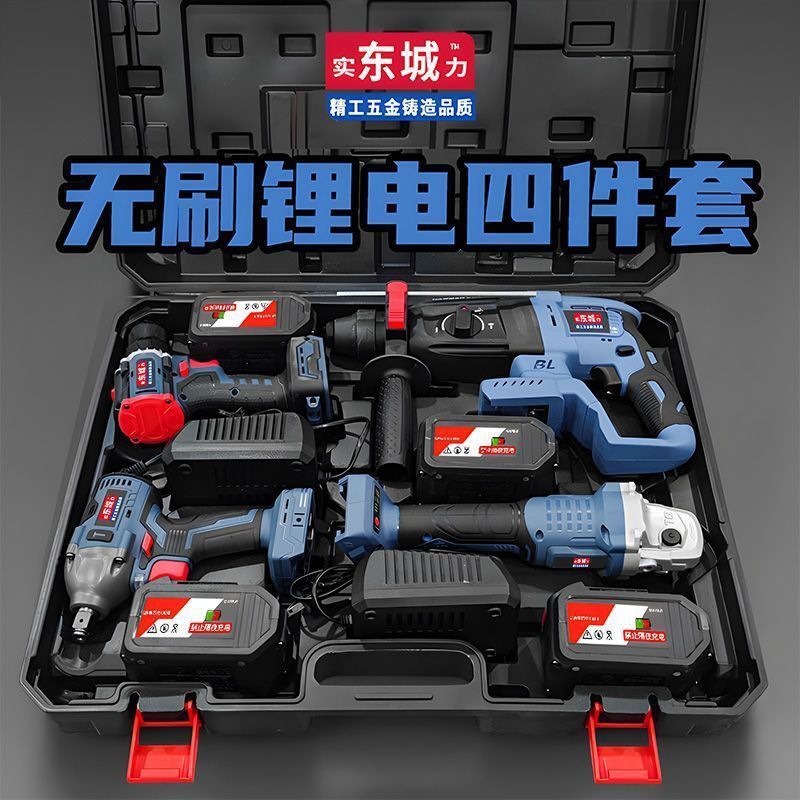 东城款池无刷充电电锤冲击钻电捶角磨机电动扳手四件套工具套装
