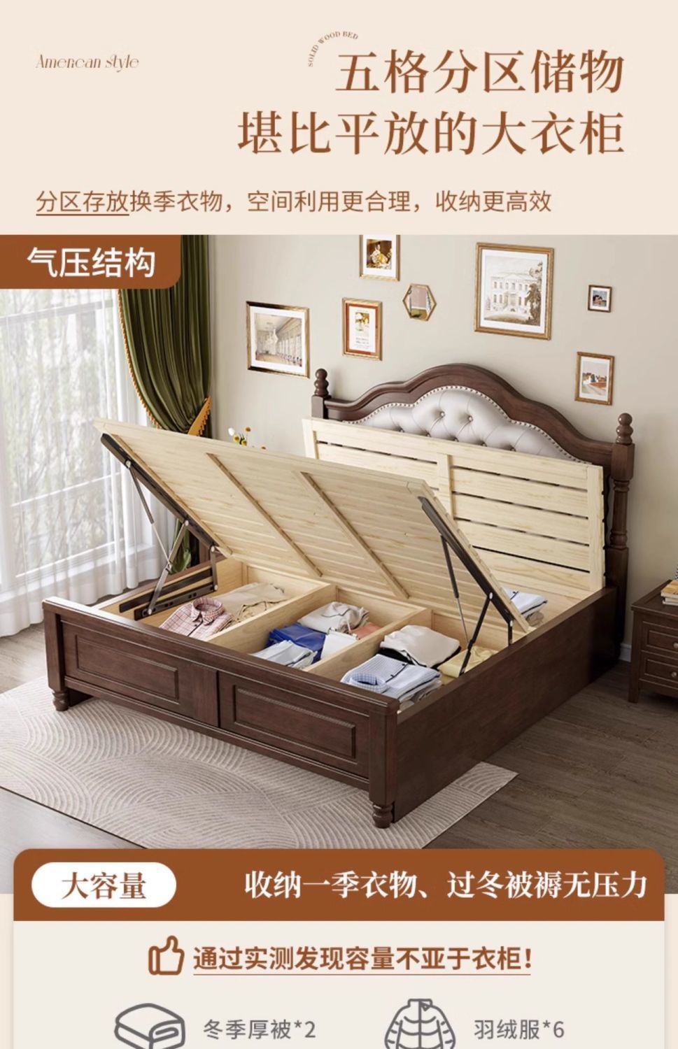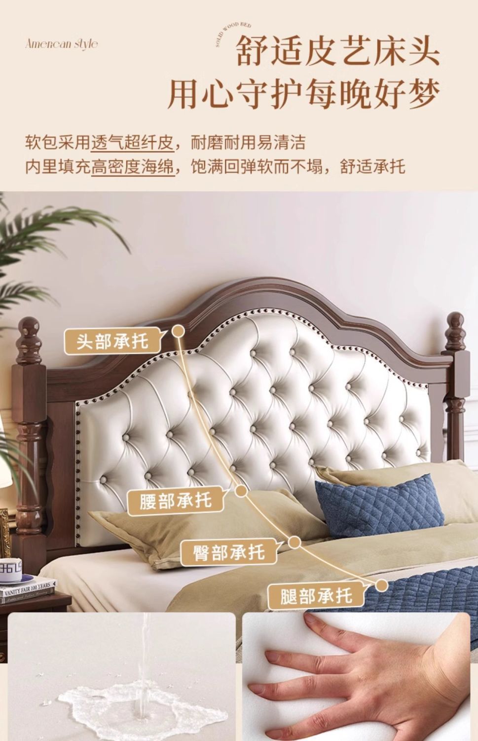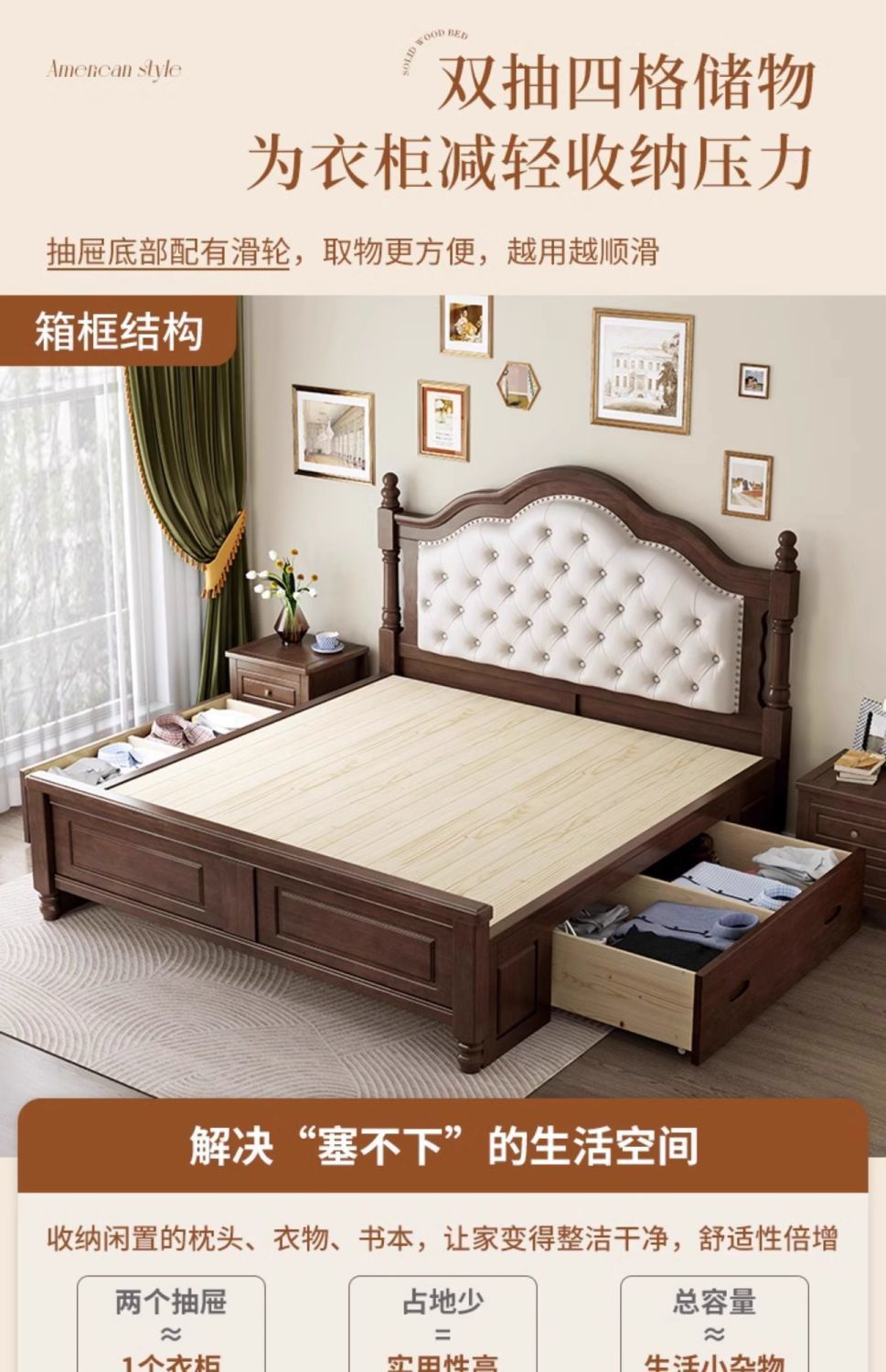 美式复古实木床安娜软包床主卧1.8双人法式1.5中古风新款储物婚床
