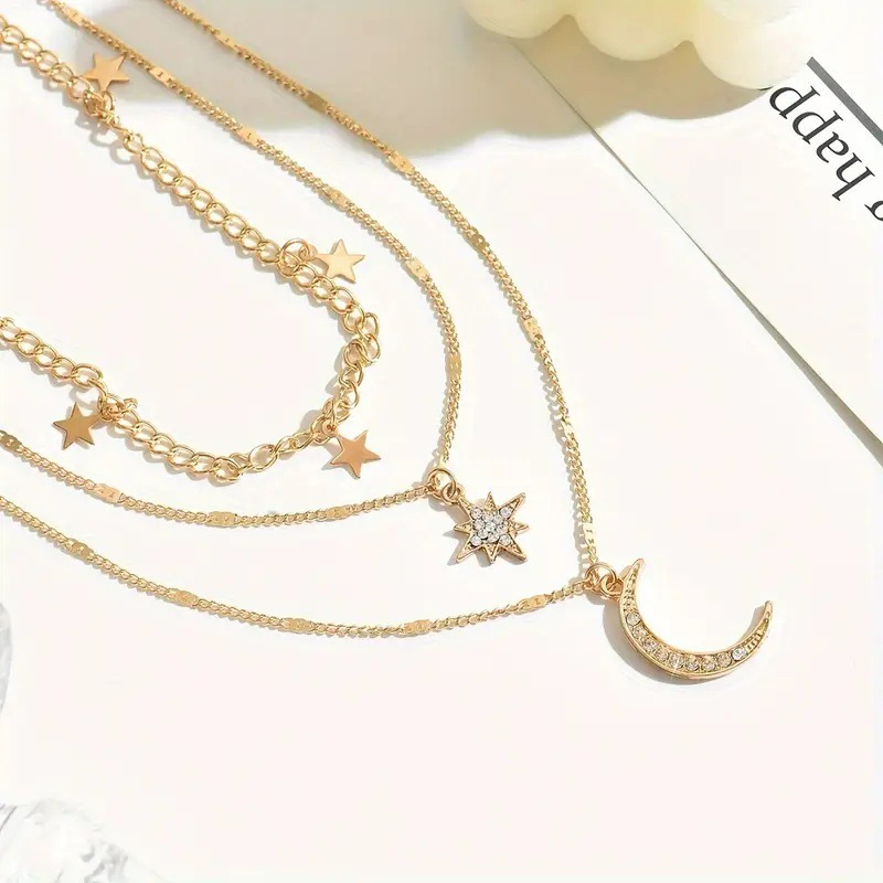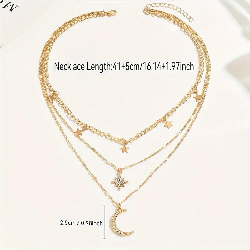 跨境五角星月牙吊坠项链女时尚镶钻多层叠戴项链个性设计感锁骨链