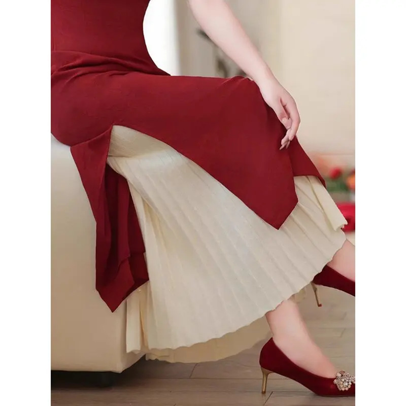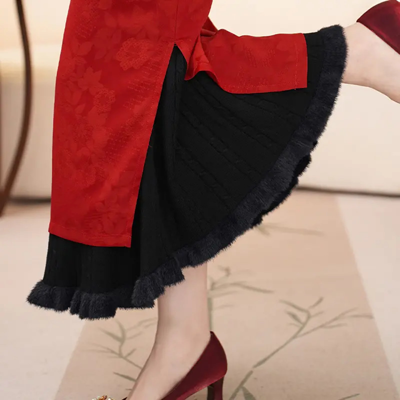 スリムな赤色の中国風ロング丈秋用長袖旗袍改良版ママ服女性用レトロスリムフィットウエストシェイプ秋冬
