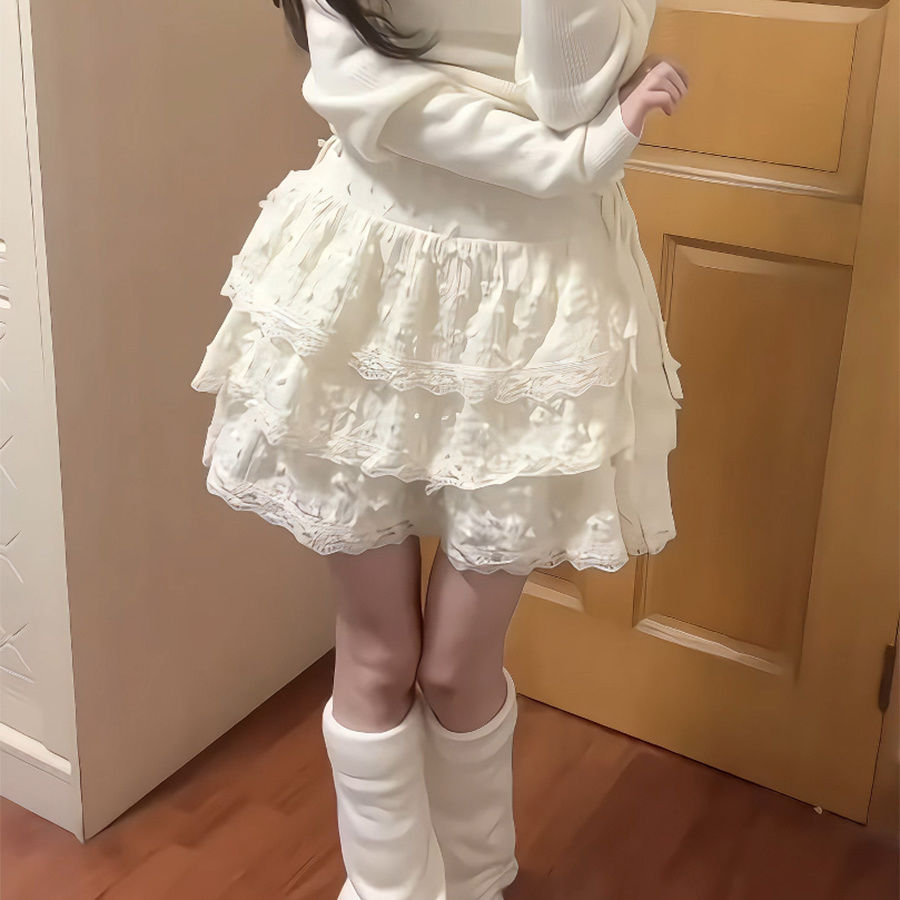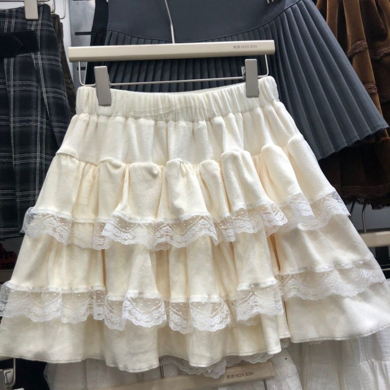 2025 秋冬甘い年齢軽減白バレエスタイルスカート女性のハイウエストチュチュスカートレースケーキスカート